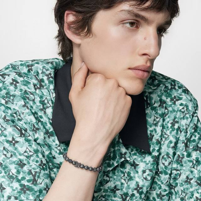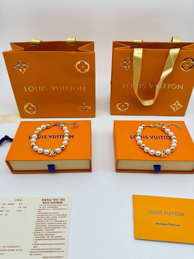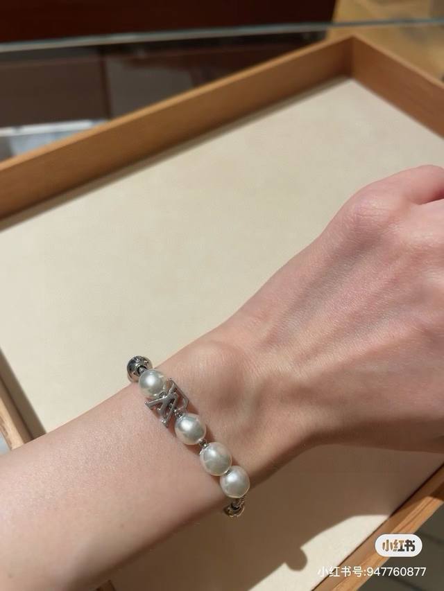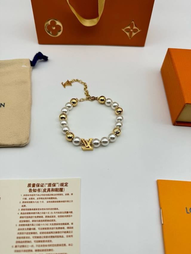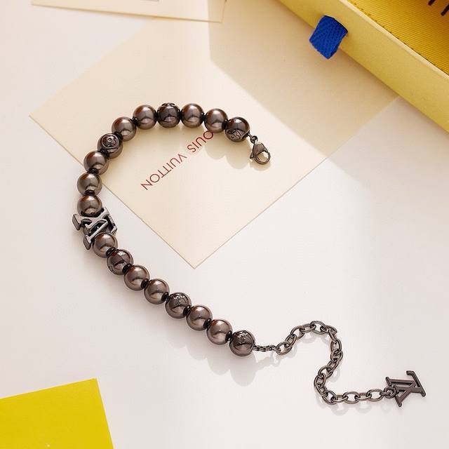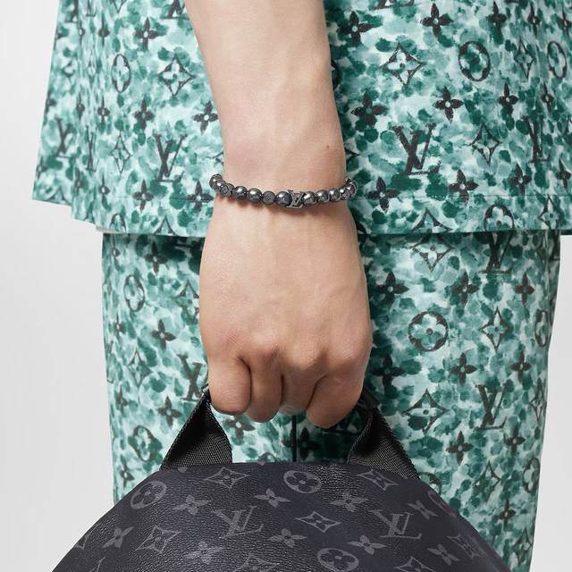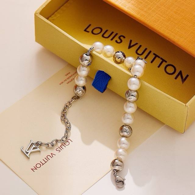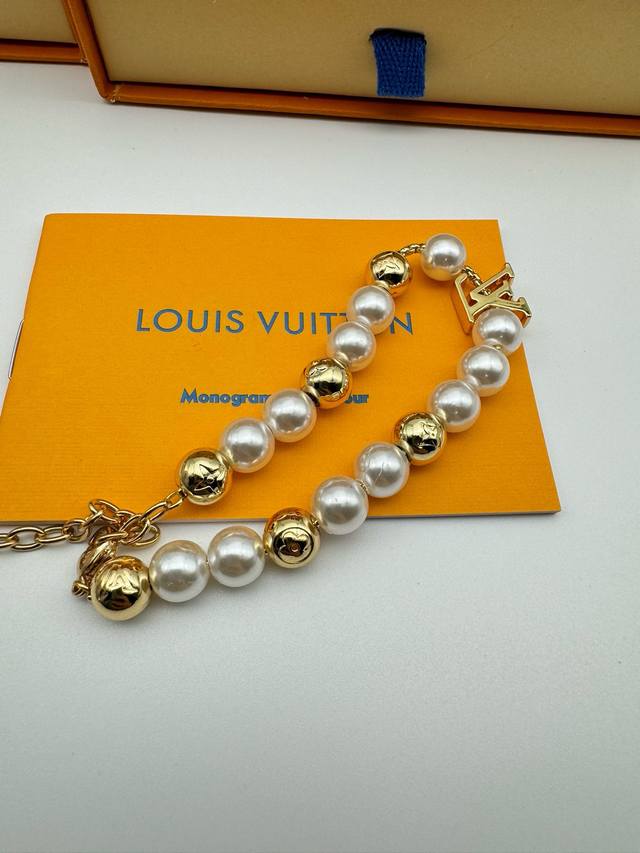 Louis Vuitton (LV) Pearl Bracelet with Full Packaging. The Monogram Pearls bracelet features lustrous metal beads engraved with the Monogram pattern, creating a visual focal point with the pearl-like beads and LV beads. It includes an adjustable chain and LV embellishments. A necklace is also available from the same collection. Adjustable chain length, metal beads, engraved logo, made in Italy.