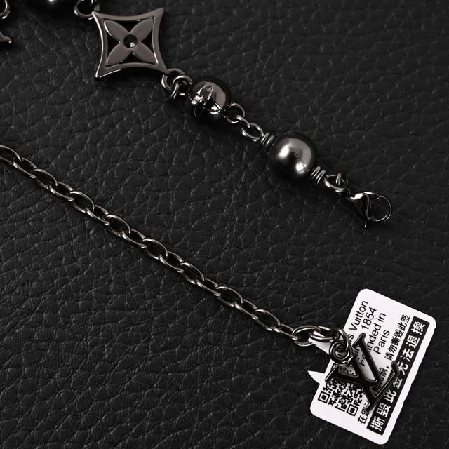 Lvpearls bracelet features Damier inscribed metal beads interlaced with the Louis Vuitton logo on the chain, creating a classic look with calming tones that adds sparkle to any occasion.