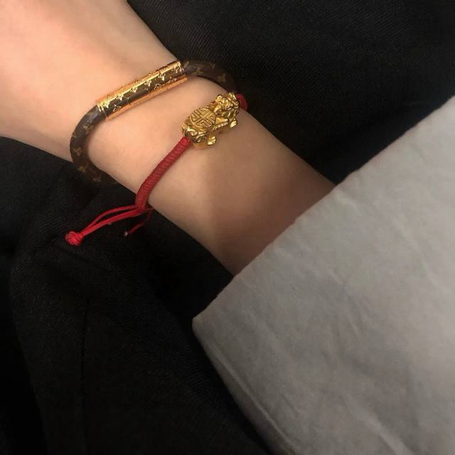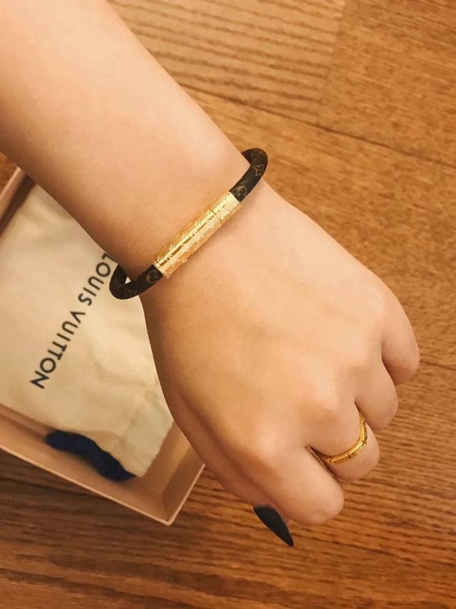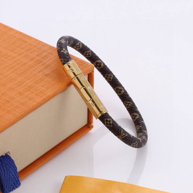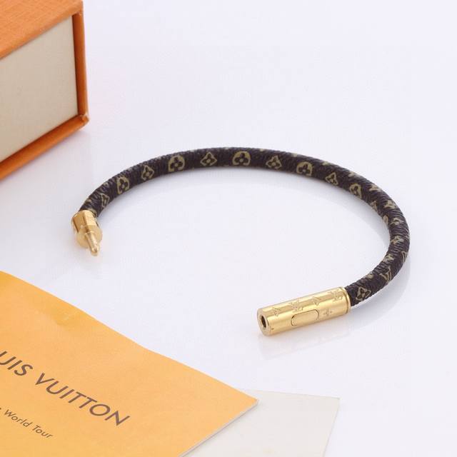 ) Made of leather, this bracelet features the exquisite LV logo. The leather and metal surfaces complement each other, creating a unique design that exudes a sense of luxury. Understated yet sophisticated, it's timeless and beautifully crafted, showcasing exquisite craftsmanship. Comes with full packaging, making it a suitable gift. A stylish matching pair for your boyfriend, this single-layer bracelet is made of iconic Monogram canvas, with a delicate Monogram pattern engraved on the clasp. It complements any style, can be worn alone or with other bracelets, highlighting a strong fashion personality. Detailed Features: - Shiny gold-plated brass; - Monogram canvas bracelet with canvas lining; - Monogram pattern engraving. Incredibly high value for money. - Sizes: Men's 19.5cm, Women's 17.5cm.