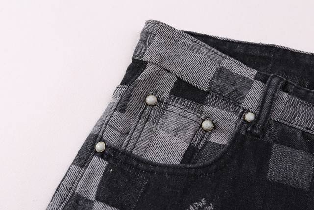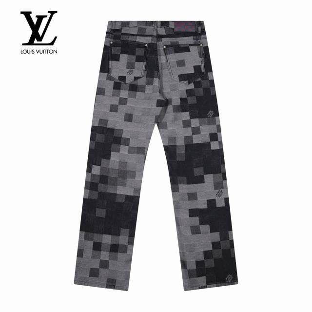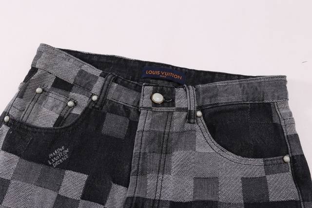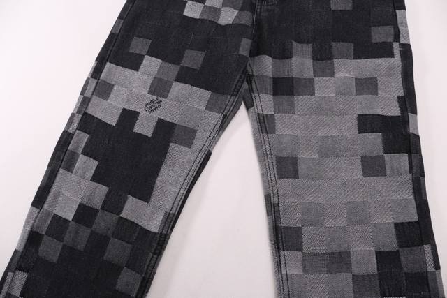 Louis Vuitton mosaic checkerboard jeans, unisex. The denim is covered with an all-over Damoflage jacquard, a specific mosaic camouflage pattern designed in jacquard form, which enhances the beauty and design of the denim. Skateboard straight jeans fit Skateboard jeans are usually designed with a loose fit to accommodate the large movements and squats encountered during skateboarding. The jeans have a straight shape, maintaining a consistent width from the hip to the hem. Suitable for all body types, the straight-leg skate pants are designed for comfort and freedom, making them ideal for skateboarding. The threshold buttons use the new pearl button closure design, and the rear is embellished with the new season Damier label. The pattern is custom-sewn in pairs, and a full set of new accessories are available.