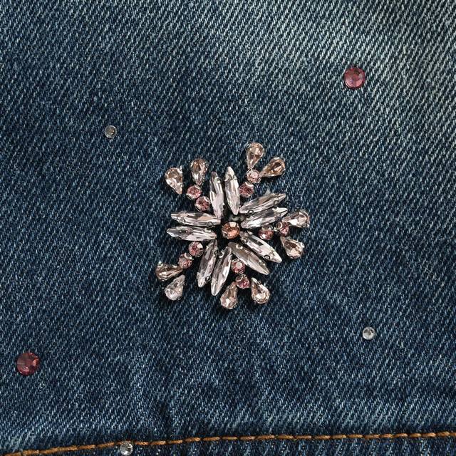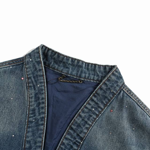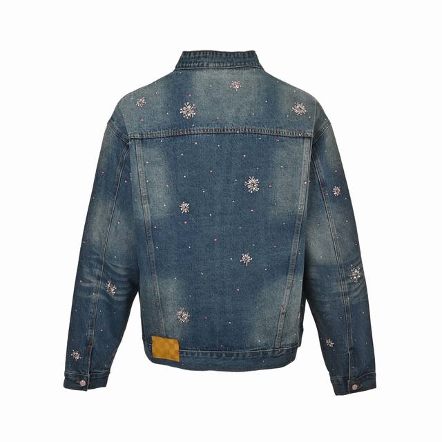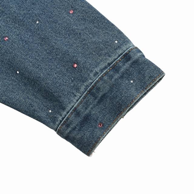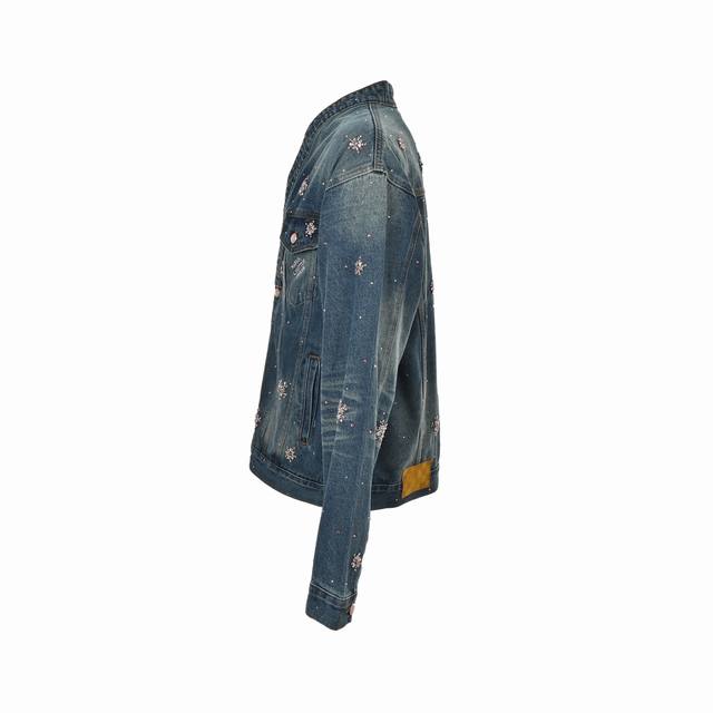 Louis Vuitton Nigo Collaboration Cherry Blossom Hand-stitched Rhinestone Denim Jacket. Made from washed denim fabric, this jacket boasts a unique faded, natural texture. Each jacket's wash effect is one-of-a-kind, giving it a distinctive charm. The entire jacket is covered in hand-set, jewel-like rhinestone cherry blossom patterns. Each rhinestone is carefully selected and meticulously set, requiring exceptional craftsmanship to ensure their neat and secure arrangement. The "Marque L. Vuitton D
