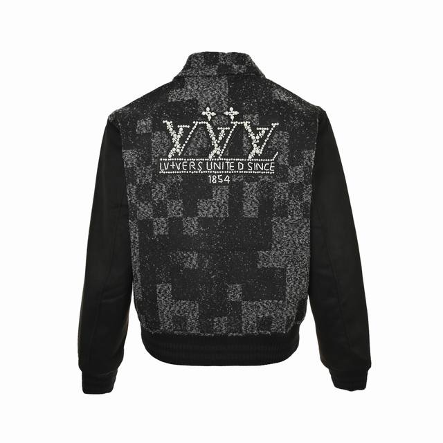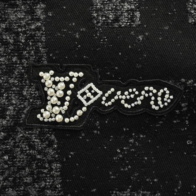Louis Vuitton Pharrell Collection Pearl Rhinestone Mosaic Baseball Jacket. This new Louis Vuitton baseball jacket features a pearl-embellished tweed body with the Damoflage pattern from the Spring/Summer 2025 fashion show, creating a striking look with its elegant cut. Rhinestones and resin beads illuminate the logo appliqu