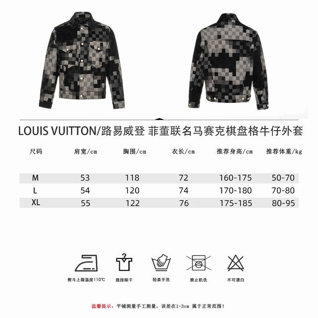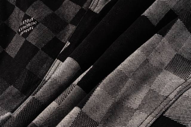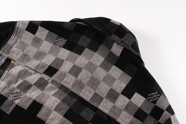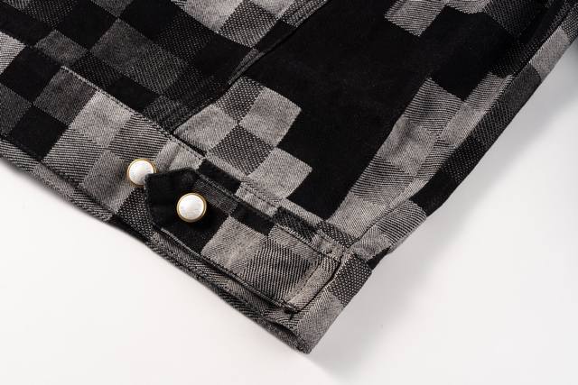 Louis Vuitton Pharrell Williams Collaboration Mosaic Checkered Denim Jacket. This is a high-end, original-fit, custom-made twill cotton denim jacket. The jacket features a custom-woven gradient mosaic checkered fabric, with the letter jacquard on the denim perfectly replicated. Due to the manual layout and cutting, the fabric wastage was very high. The jacquard patterns are consistent in size and spacing, and the workmanship is extremely complex. The washing process uses an yeast wash to create an aged look. The original pearl hardware with laser-engraved logo has a minimum order quantity of 60,000 pieces. All 13 pearl buttons are hand-sewn. All accessories are custom-made, with perfect attention to detail. The loose-fitting denim cut is crisp and stylish. The contrasting light and dark mosaic checkered jacquard texture is high-end and fashionable. Double pockets on the chest embellish the overall design, and the jacquard lettering highlights the brand's style. An unrepeatable work of art. Color: Black. Size Chart: M, L, XL.