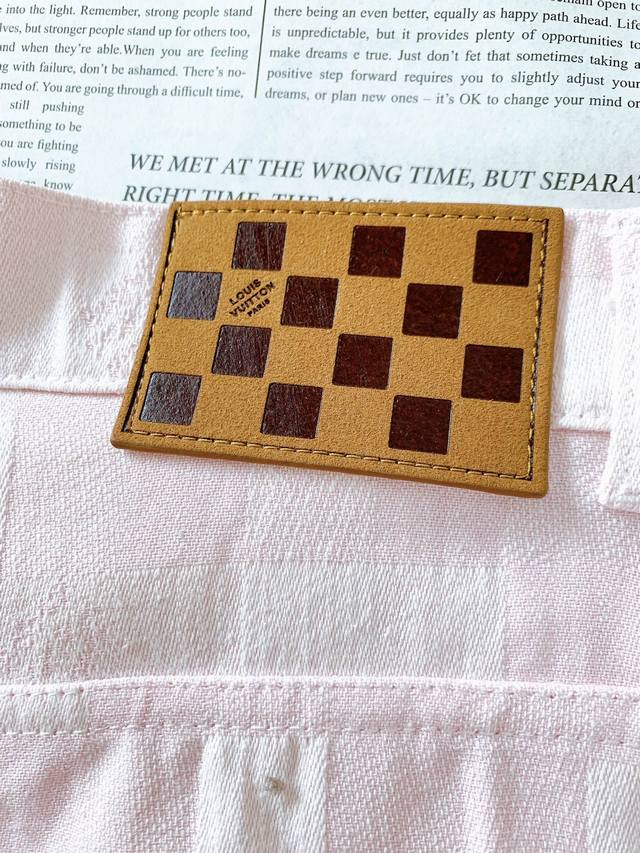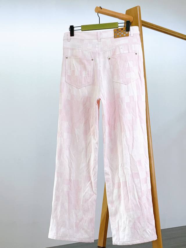 Louis Vuitton Pink Damier Jeans (Ddd) - The same style worn by Gillian Chung (Ah Jiao) - This unique pink damage checkerboard jeans breaks away from the monotony of traditional denim. It inherits classic brand elements while adding a romantic touch with its soft pink hue, making it eye-catching and chic. The "Marque Lvuittcn Deposee" leather tag on the small pocket highlights the brand identity; the classic checkerboard leather patch at the back waistband is embossed with "Louis Vuitto* paris," exuding sophistication. The straight-leg design flatters the legs, easily creating a casual yet stylish look whether paired with a simple white T-shirt or a trendy cropped top. The buttons at the waistband are engraved with the brand's initials, adding a touch of quality; the stitching is fine and even, the pocket edges are neatly stitched, and the hardware rivets are sturdy and textured, combining durability and aesthetics. These pink checkered jeans from DDD perfectly blend the brand's classic style with springtime romance, ensuring you'll easily become the center of attention whether strolling the streets or attending a fashionable party. Sizes: 30, 32, 34, 36