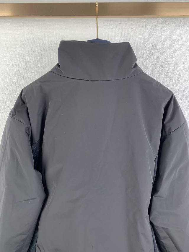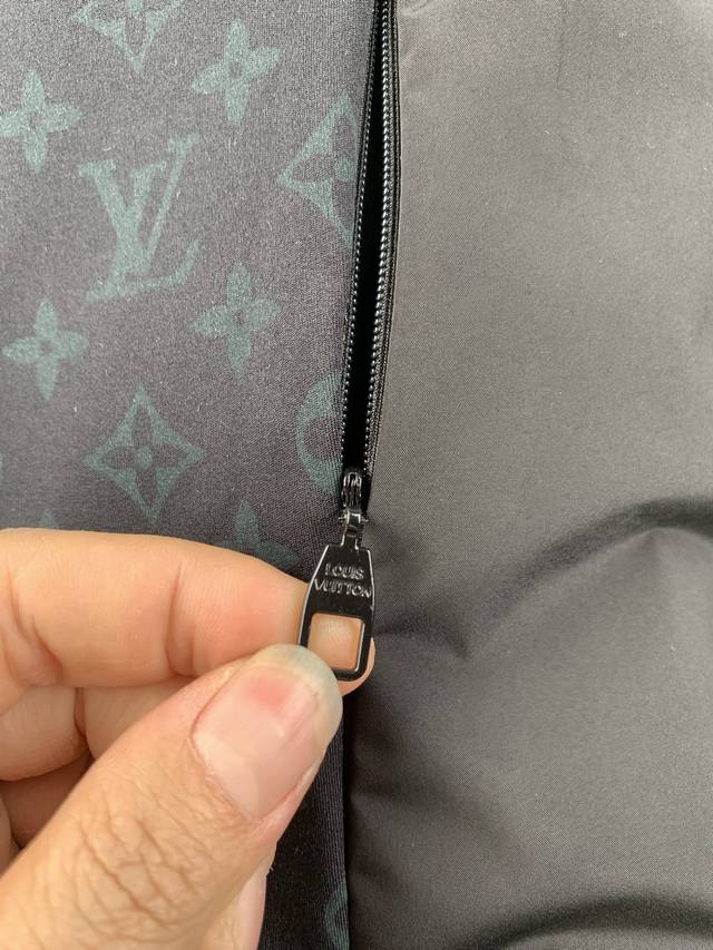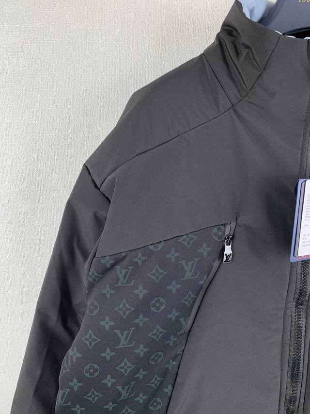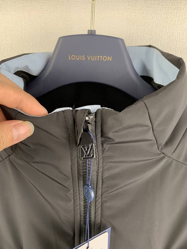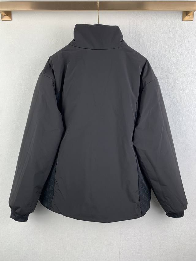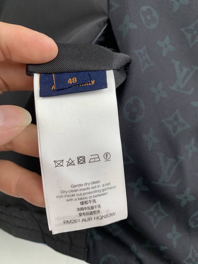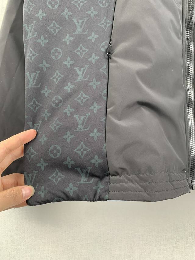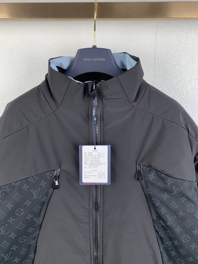 Louis Vuitton Reversible Logo Patchwork Jacket. Made from imported high-density windproof nylon fabric, this jacket is lightweight yet structured, offering excellent waterproof and windproof performance. Both sides undergo special processing for a smooth feel and excellent drape, balancing practicality and comfort. The reversible design features a light blue and black mesh sporty silhouette with the brand's logo on the shoulder, while the other side is black with a subtle logo print, understatedly showcasing the brand's identity. One jacket unlocks two different styles. The stand-up collar features a hidden zipper closure, providing a snug fit around the neck while enhancing wind protection. The seams are meticulously crafted with clean, flowing lines. The overall loose, casual fit is flattering for all body types, suitable for everyday casual wear or outdoor activities. Size: 46 48 50 52