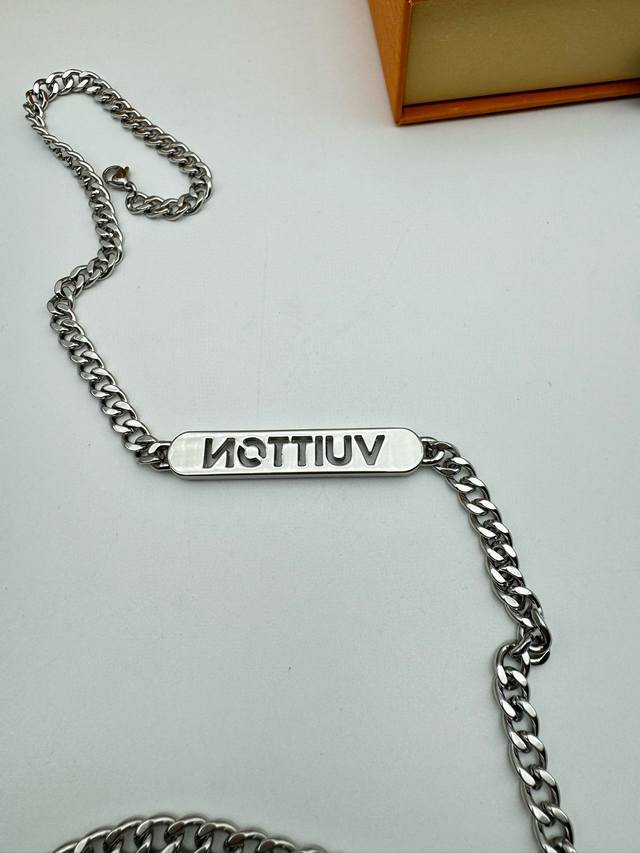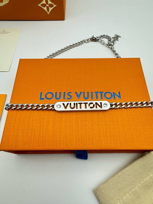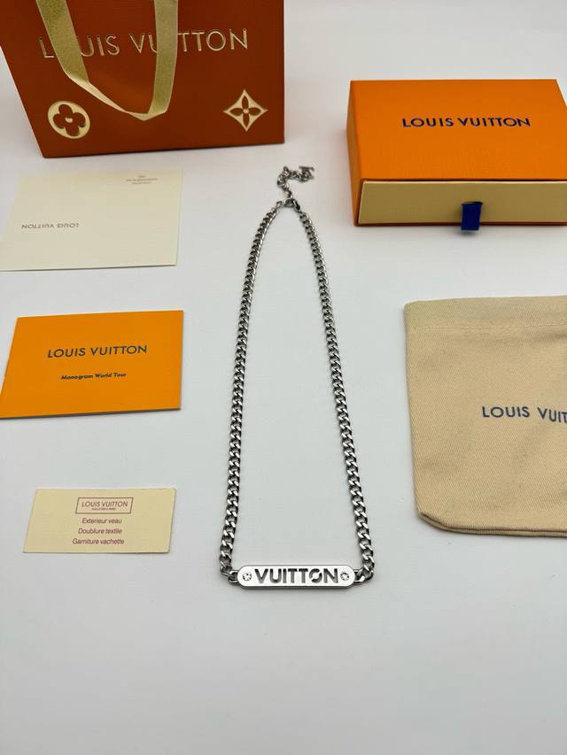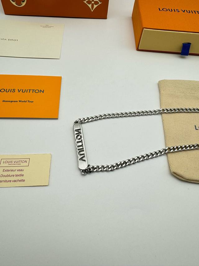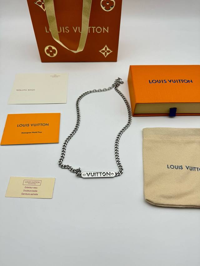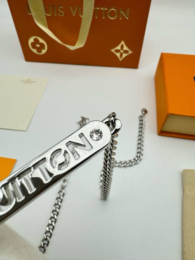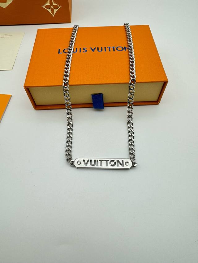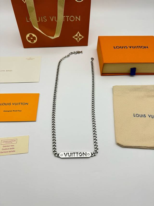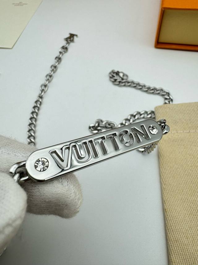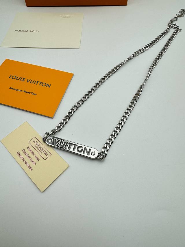 Louis Vuitton Straight Bar Necklace with Diamonds and Full Packaging. This necklace is from the new season's fashion jewelry collection. The Vuitton logo is engraved on a central metal plaque using a perforated technique, and sparkles with crystals on both sides. It features an adjustable chain. (Metal, Glass, Louis Vuitton elements, Chain length: 58cm)