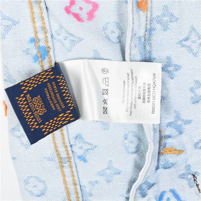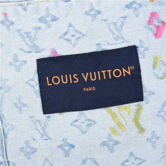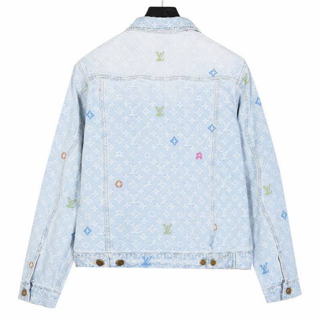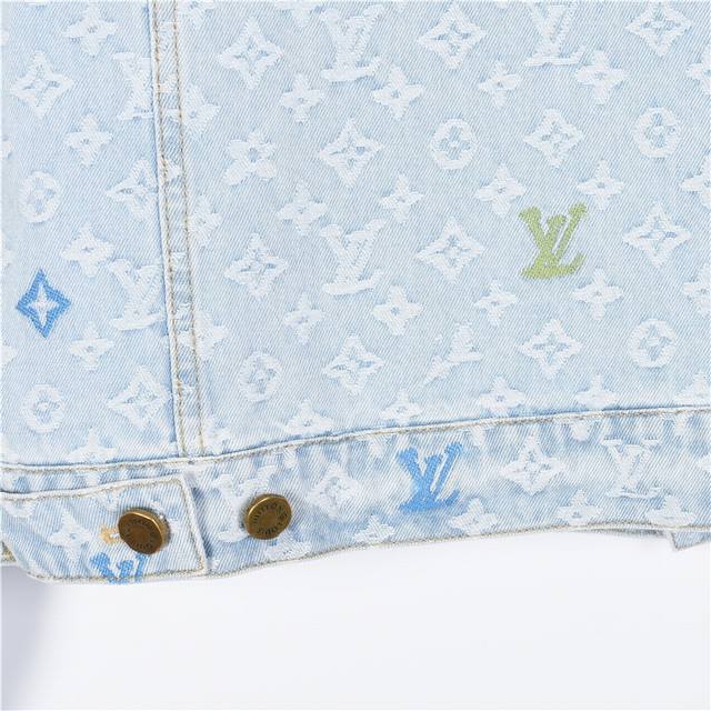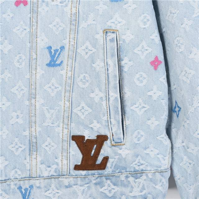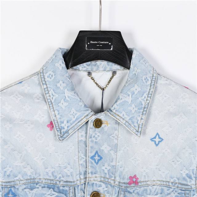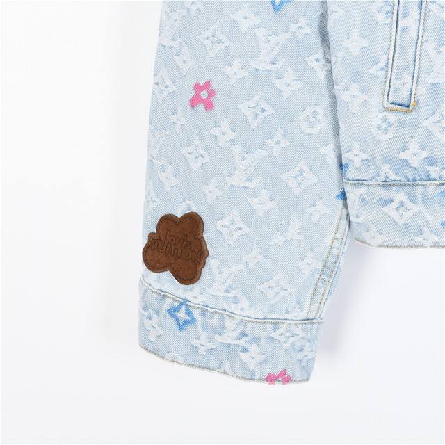 Louis Vuitton x Tyler Collaboration Candy Embroidered Denim Jacket. Custom-made twill jacquard denim with a premium feel. The washed, distressed, light gray-blue color is adorned with the monogram pattern. Simple yet sophisticated, the leather patches on the sleeves echo the front pockets. This button-down jacket presents a casual yet chic style. Custom fabrics and accessories are available upon request. Choose the correct version and pair with matching jeans. Size: M-XL
