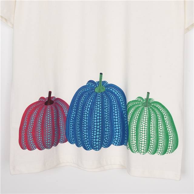 Louis Vuitton x Yayoi Kusama Collaboration Pumpkin Print Short-Sleeve T-Shirt This T-shirt is from the Louis Vuitton x Yayoi Kusama collaboration, featuring a pumpkin print emerging from the hem, echoing the timeless theme in the Japanese artist's work. It's made of soft cotton knit with a ribbed collar, and the brand logo adorns the left chest. Size: S-XL