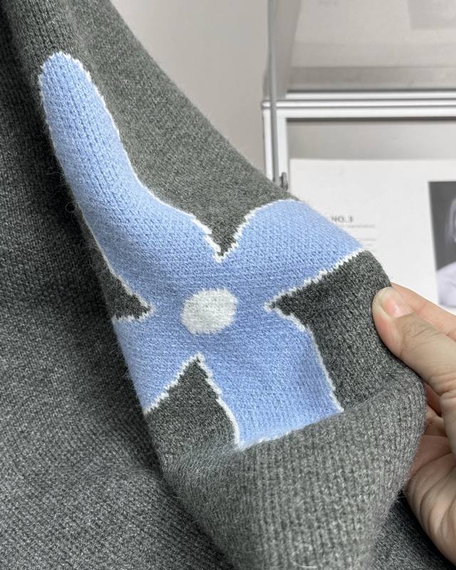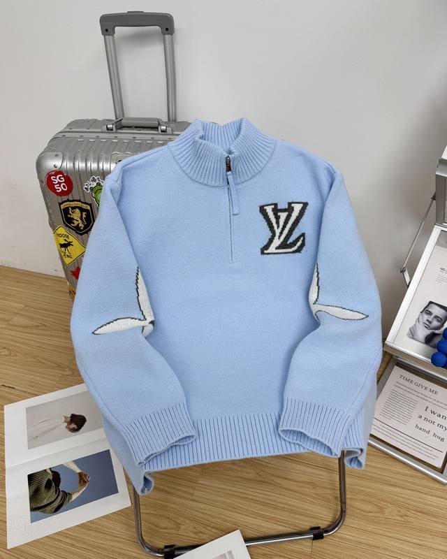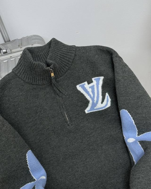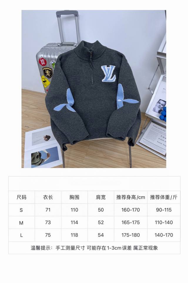 Louis Vuitton's classic jacquard-knit wool pullover, a stand-up collar ski sweater, is available in three colors. This new cotton-knit waistcoat jacket features jacquard intarsia detailing, with the brand logo and Lv monograms embellished on the front and back, easily integrating into everyday looks. This unisex, couple's style features a high-top design. The fabric is refined and comfortable, with a loose, effortless fit. The thick, heavyweight material creates a high-top silhouette that's both trendy and stylish. Detailed, 1:1 reproduction of the official website. Colors: Gray, White, Blue. Sizes: S-L-M. Size chart: Figure 9.