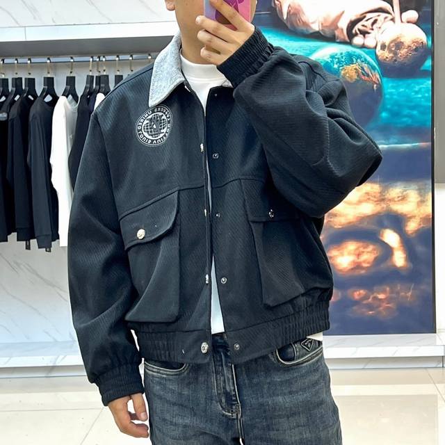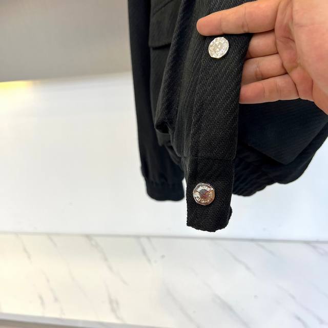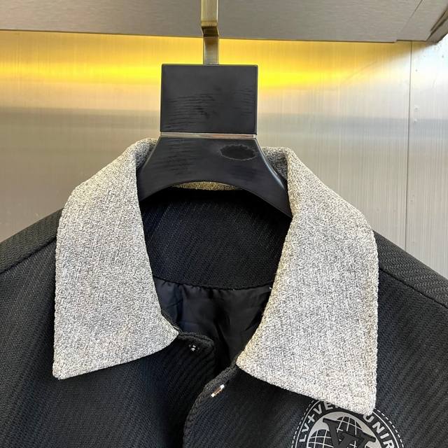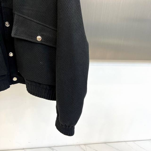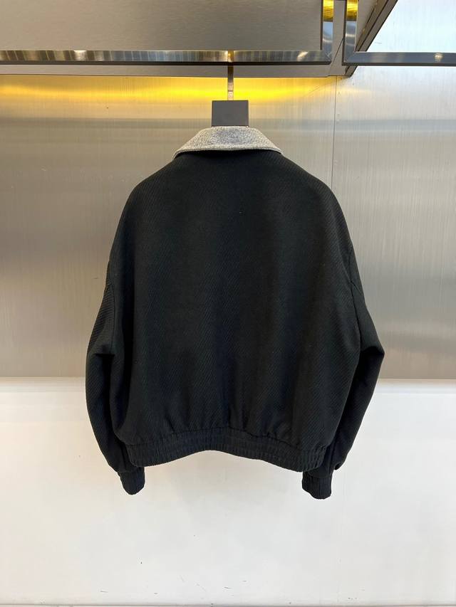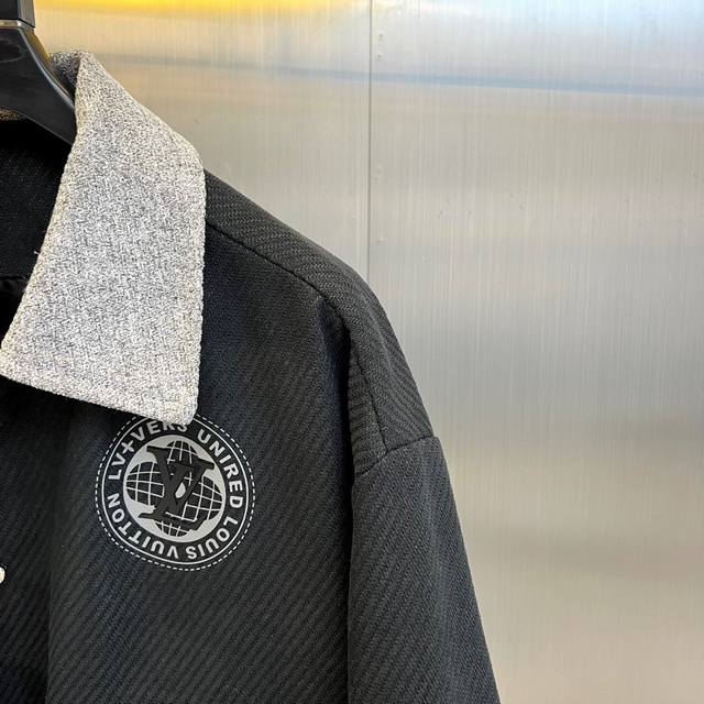 Louis Vuitton's Fall/Winter 2025 men's jacket redefines autumn/winter outerwear with the brand's signature travel aesthetic and modern urban style. This jacket features a contrasting light grey body with a dark brown collar, a stand-up collar, and a smooth zipper closure, creating a clean and crisp silhouette. A classic Louis Vuitton circular badge on the chest subtly highlights the brand's identity; symmetrical large pockets on both sides are adorned with metal snap buttons, combining practicality with refined details. Knitted cuffs and hem enhance warmth and add a touch of retro casualness. The tailored, streamlined cut ensures comfort and a sharp silhouette. The light grey hue exudes a sophisticated feel, pairing well with casual trousers for an urban chic look or with dress trousers for a new business casual style. Louis Vuitton elevates this jacket with exquisite craftsmanship and innovative design, transforming it into an essential piece that combines luxury and practicality, perfectly meeting the diverse dressing needs of men for Fall/Winter 2025. Model 48-56, 173cm tall, 143kg, size 50 (