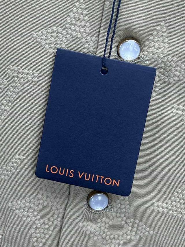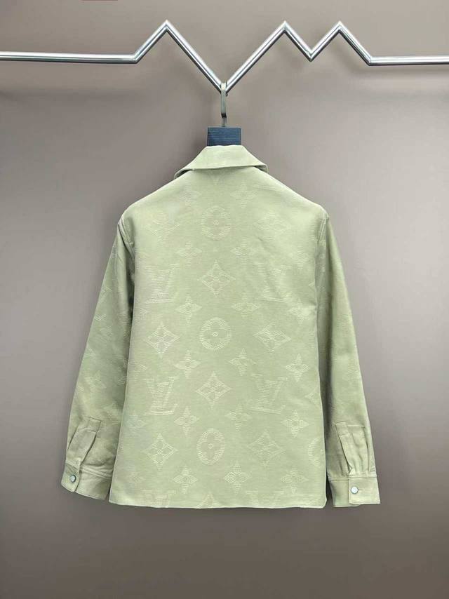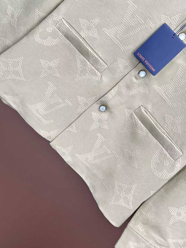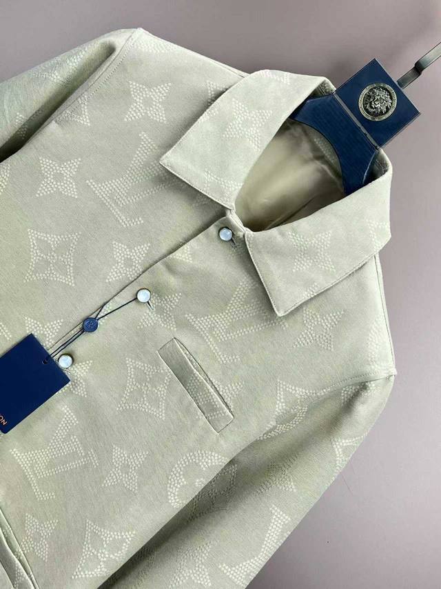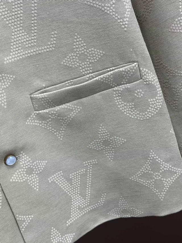 Louis Vuitton's new 25Ss jacket-style shirt features the Safari Monogram pattern from the Spring/Summer 2025 runway on cotton fabric, with embroidery creating a 3D effect. Pearlescent buttons add a touch of understated elegance. Paired with matching trousers to showcase the brand's sophisticated style. Sizes: S, M, L, XL.
