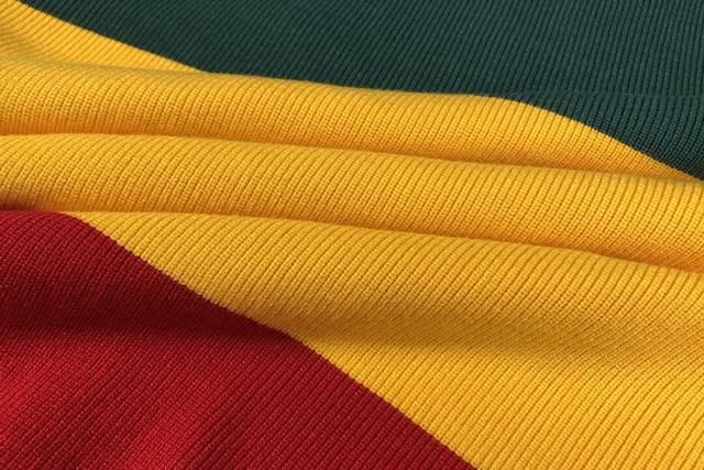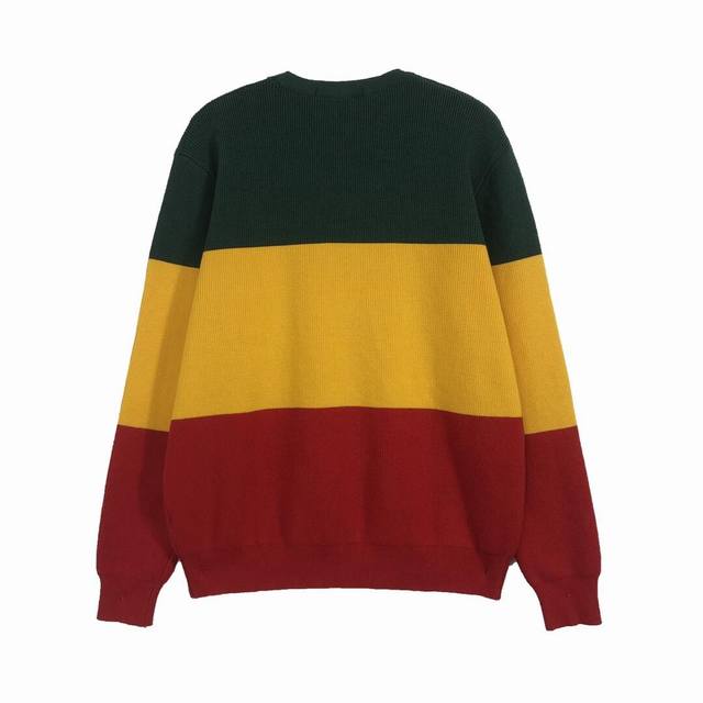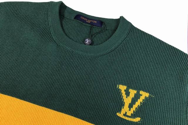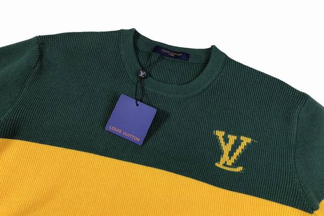 Louis Vuitton's three-tone casual crewneck sweater is custom-made from a modern sheep and wool blend. Soft and comfortable against the skin, the front panel features the iconic Lv logo, blending seamlessly into the overall design. The red, yellow, and green colors create a perfect blend of texture, refined yet dynamic. This effortlessly casual, ready-to-wear sweater exudes luxury and elegance. Sizes: M-Xxl