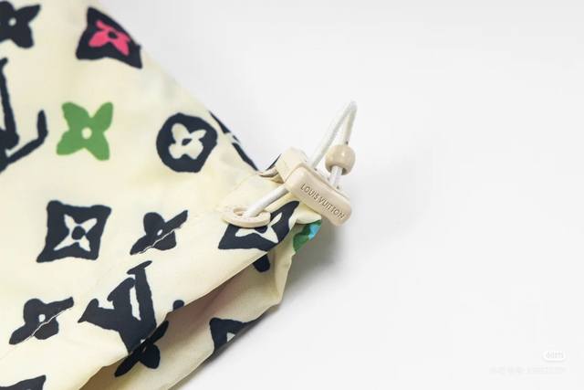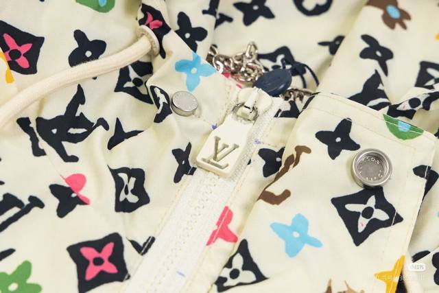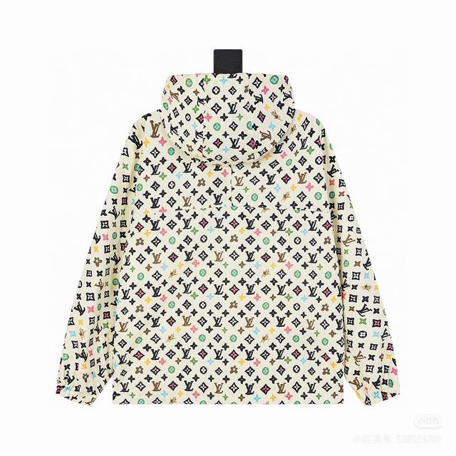 Louisvuitton Monogram print with zipper and clip. This parka, from the Spring/Summer runway, features the all-over Monogram pattern in soft, fresh colors. Lightweight, weather-resistant fabric creates a minimalist silhouette, accented by the Marque L. Vuitton D
