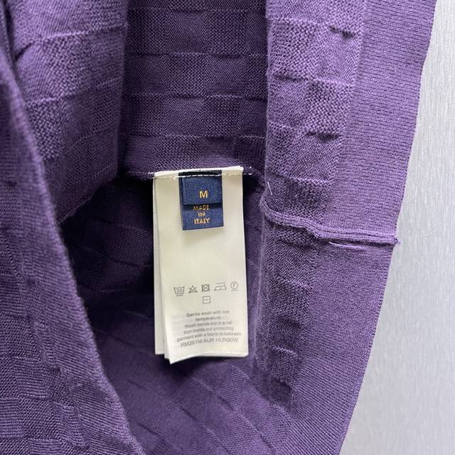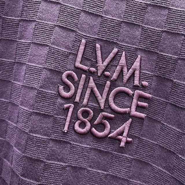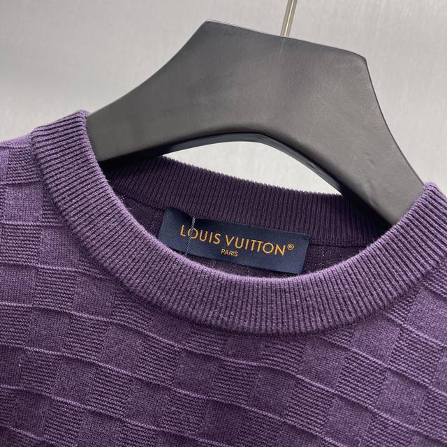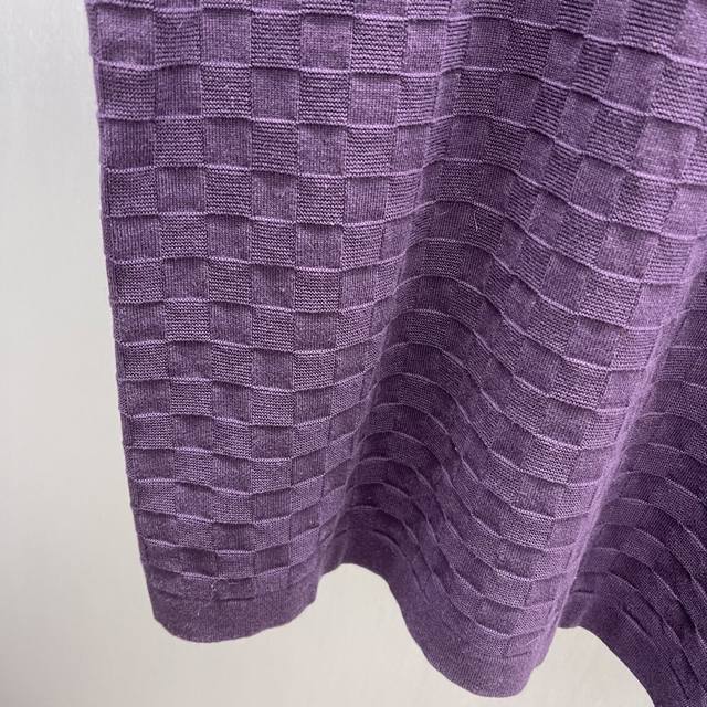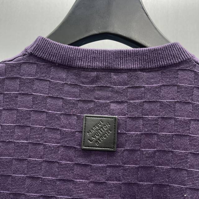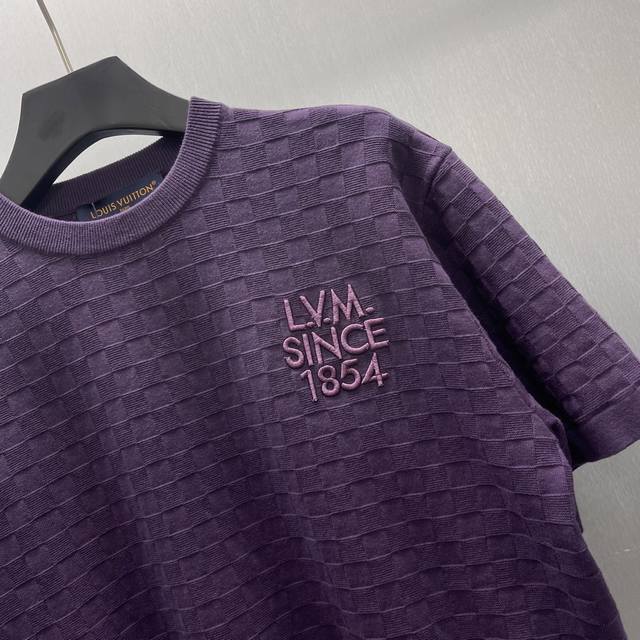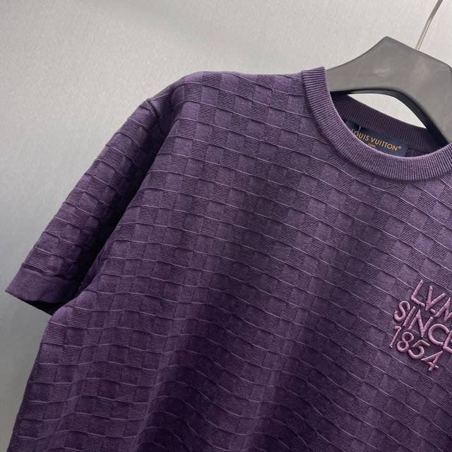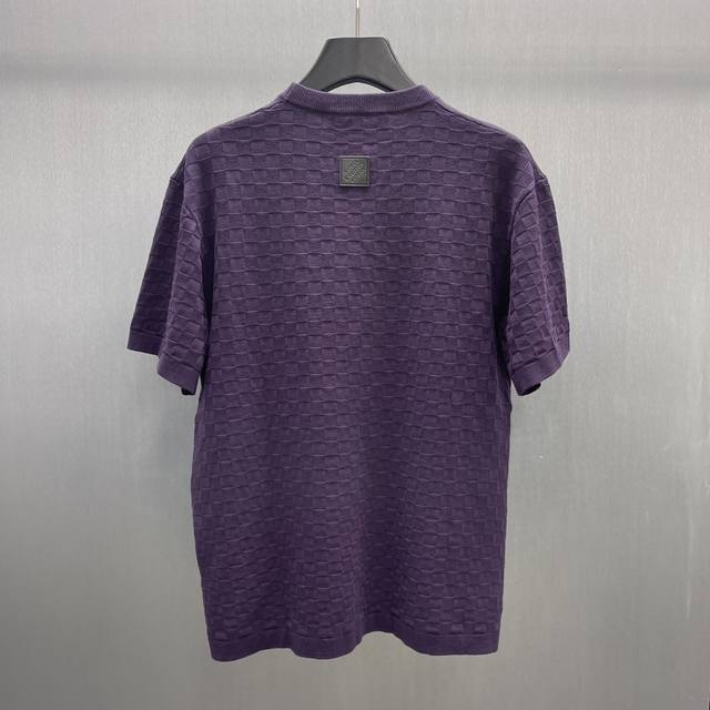 Lu Purple Checkered Knit Crew Neck Short-Sleeve Top (Ddd) Size: S-XL (Ddd) This short-sleeve cotton crew neck top is made from this season's deep-textured Damier knit fabric. It features a tonal embroidered heart logo on the chest and a leather Marque Lvuitfondeposee patch sewn onto the back. This understated design adds a subtle yet sophisticated touch to everyday wear. (DDD)