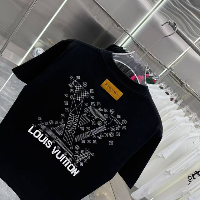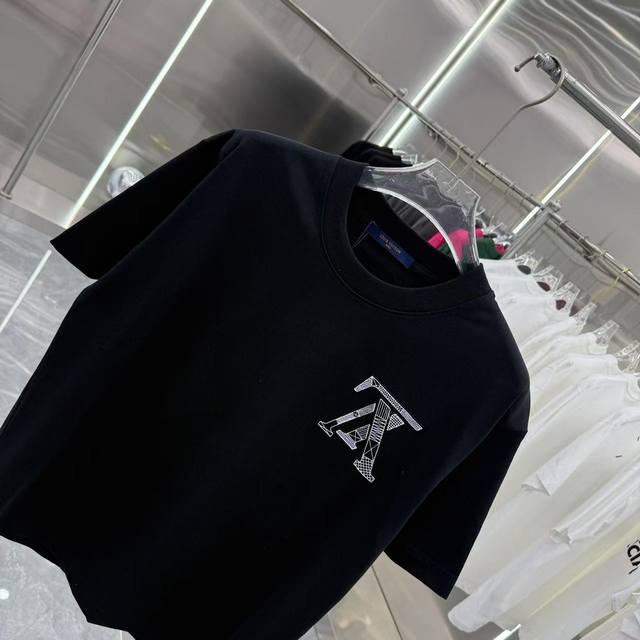 Lv 2025 autumn and winter new 320g custom fabric round neck short sleeve special embroidery unisex loose version SML Xl Xxl five sizes color black white