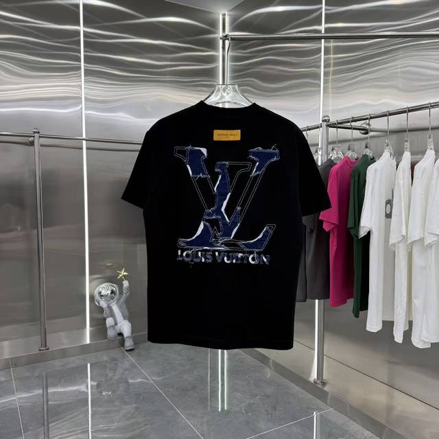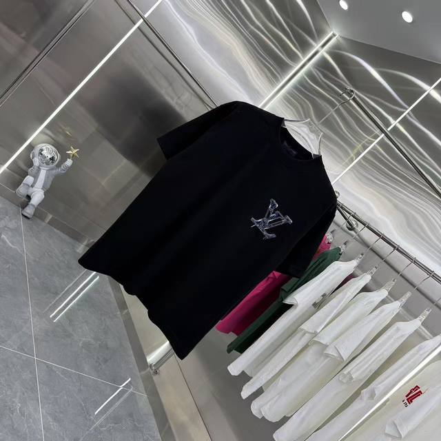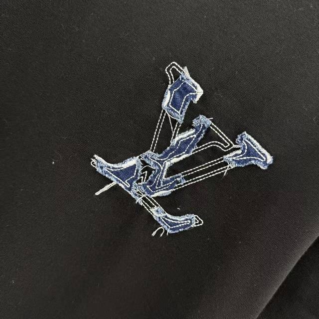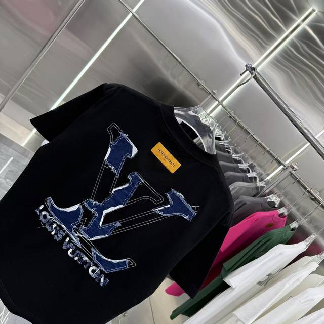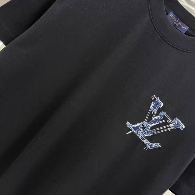 Lv 2025 Autumn/Winter New Arrival 320g Custom Fabric Round Neck Short Sleeve Embroidered + Denim Appliqu