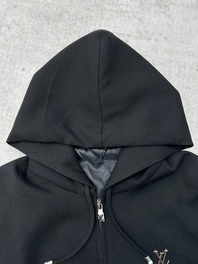 LV 25Ss New Tech Hooded Waist-cinching Jacket. This hooded waist-cinching jacket is crafted from a tech-blend wool blend with a dynamic silhouette. The drawstring ends are adorned with exquisite beads, and the lettering "LV" is prominently displayed in metal on the chest. Pair it with matching trousers for a sophisticated yet relaxed look. Sizes: S, M, L, XL.