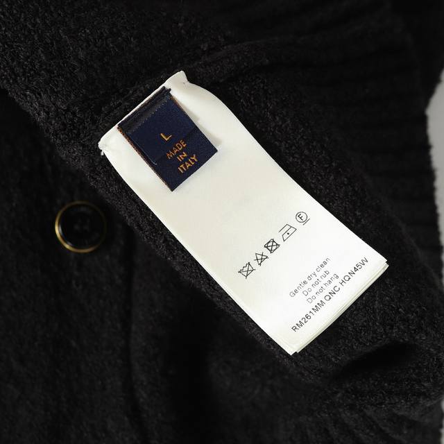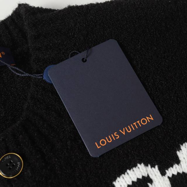 LV 26Ss Mirror Logo Intarsia Wool Cardigan (Ddd). The fabric is made of 40% cashmere, 30% wool, and 30% cotton. This is a custom-woven blend wool. The fabric is soft to the touch and has a structured, flattering silhouette. The button bases are made of alloy, with a pearlescent button and laser-engraved brand logo. The jacquard weave uses imported 7K knit for the logo, giving it a classic and sophisticated look. This cardigan is made from a blend of sheep's wool and yak wool, using thick yarn to create a soft and comfortable texture. The contrasting LV logo is integrated into the knit, and the elegant back design makes it perfect for a weekend look. (Ddd Size: SML-XL)