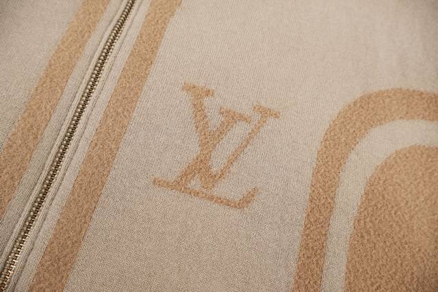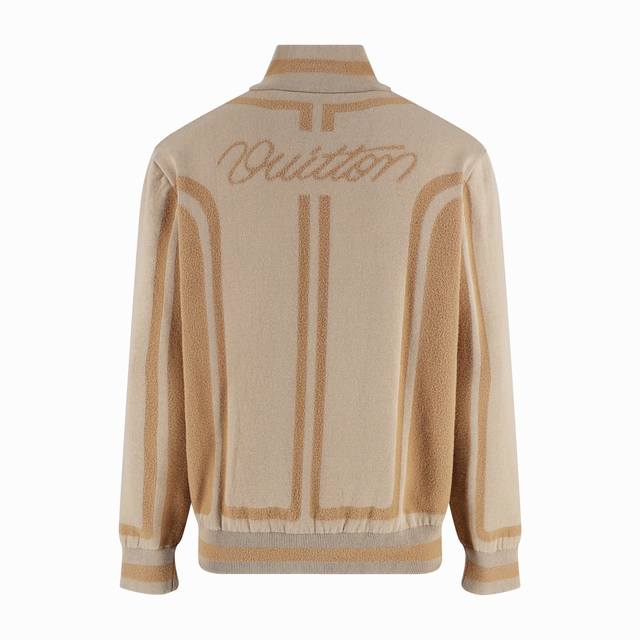 LV 26Ss Two-tone patchwork knit jacquard zip-up jacket. This two-tone knit zip-up jacket features a combination of coffee and light brown tones. Intarsia stripes run along the body and sleeves, echoing the ribbed collar, cuffs, and hem. A subtle intarsia LV logo is featured on the chest, while the back displays the "Vuitton" lettering in the same color stitch, creating a subtle 3D texture. The stand-up collar and full zip-up design offer a relaxed and comfortable fit, combining casualness and elegance. Made from a blend of 43% nylon, 32% viscose, and 25% viscose fiber, it is soft to the touch and has a good drape. Sizes: S, M, L.