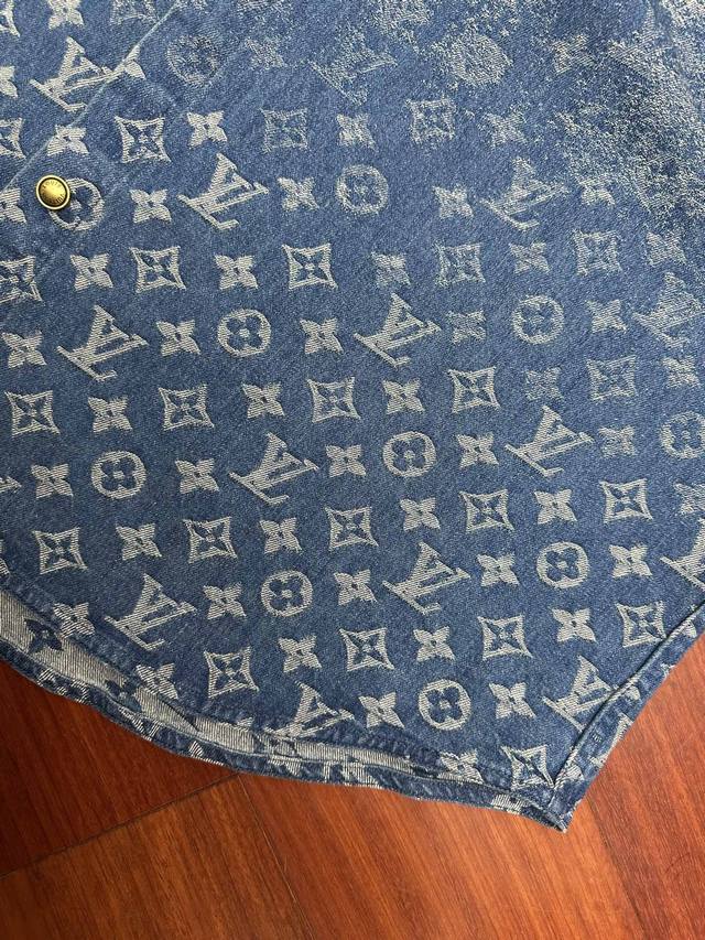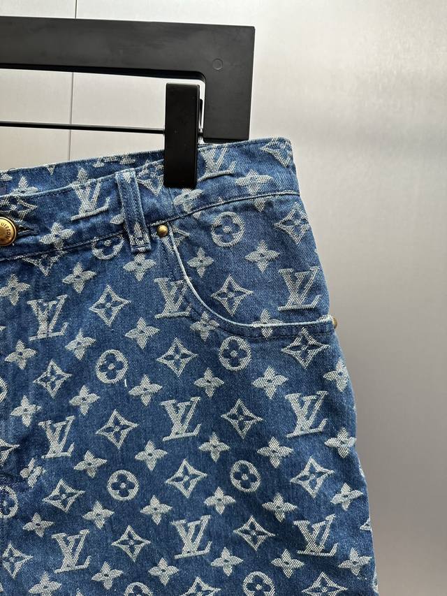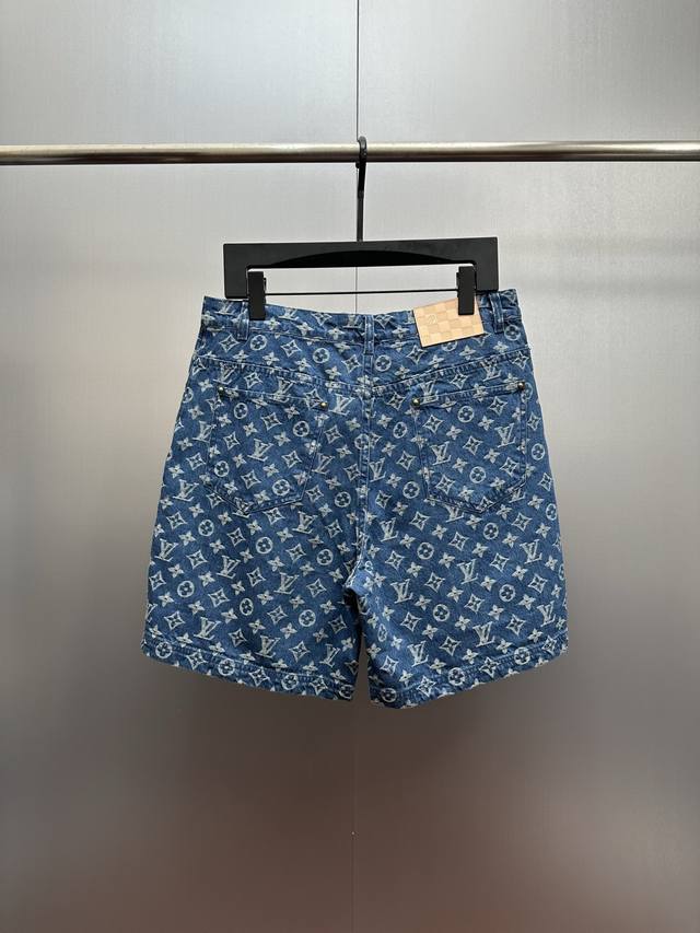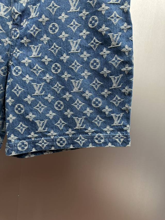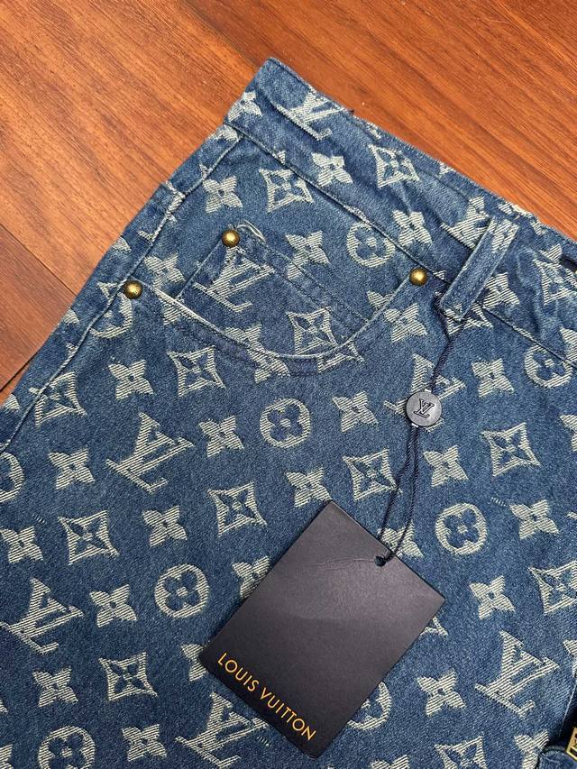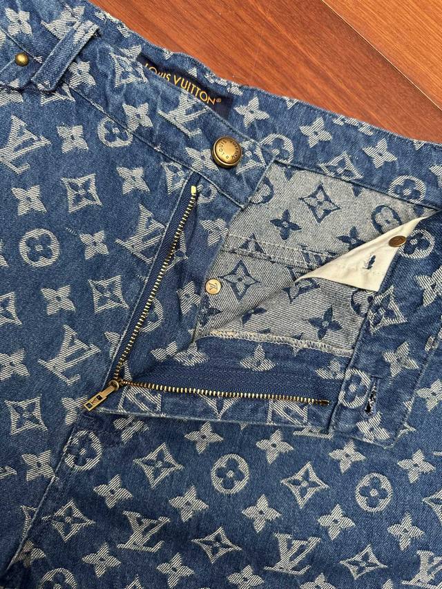 LV All-over Print Denim Shorts DDD Classic denim blue colliding with the LV monogram all-over print, a perfect blend of retro and trendy! Made from select washed denim fabric, soft yet resilient, and breathable against the skin, super comfortable for everyday wear. The loose, cropped style is incredibly forgiving, easily flattering pear-shaped and slightly chubby figures. Metal buttons and classic pocket details add a touch of sophistication. DDD Sizes: 29 30 31 32 DDD