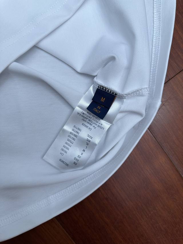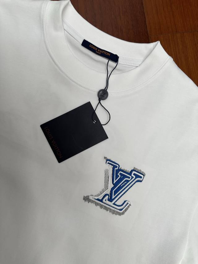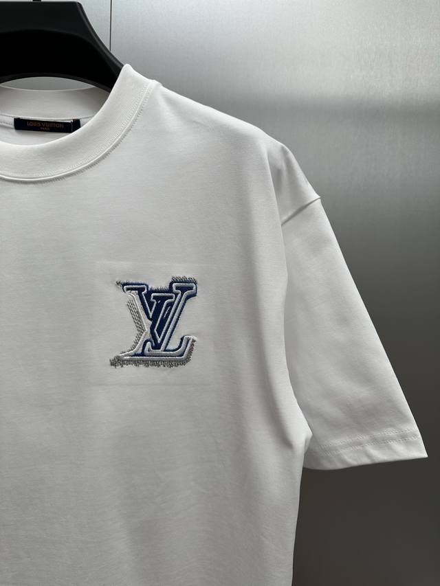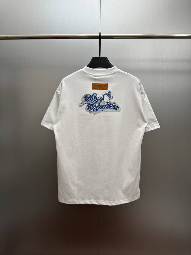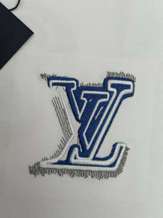 LV Blue and White Embroidered White T-Shirt DDD Made with 320g heavyweight fabric, this pure white T-shirt features a blue and white 3D embroidered logo. The design, smaller in the front and larger in the back, creates a layered look, showcasing LV's signature elements for a luxurious and trendy style! Made from select high-weight pure cotton, it's soft, supple, breathable, and resistant to pilling and deformation. The relaxed, drop-shoulder fit is incredibly forgiving, flattering all body types for a casual look. DDD Size: SML XL DDD