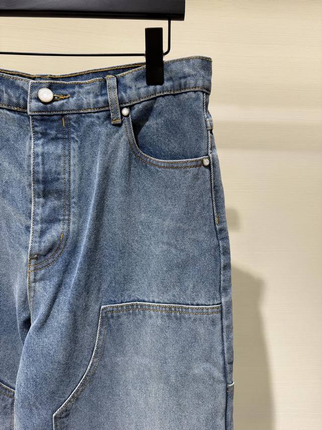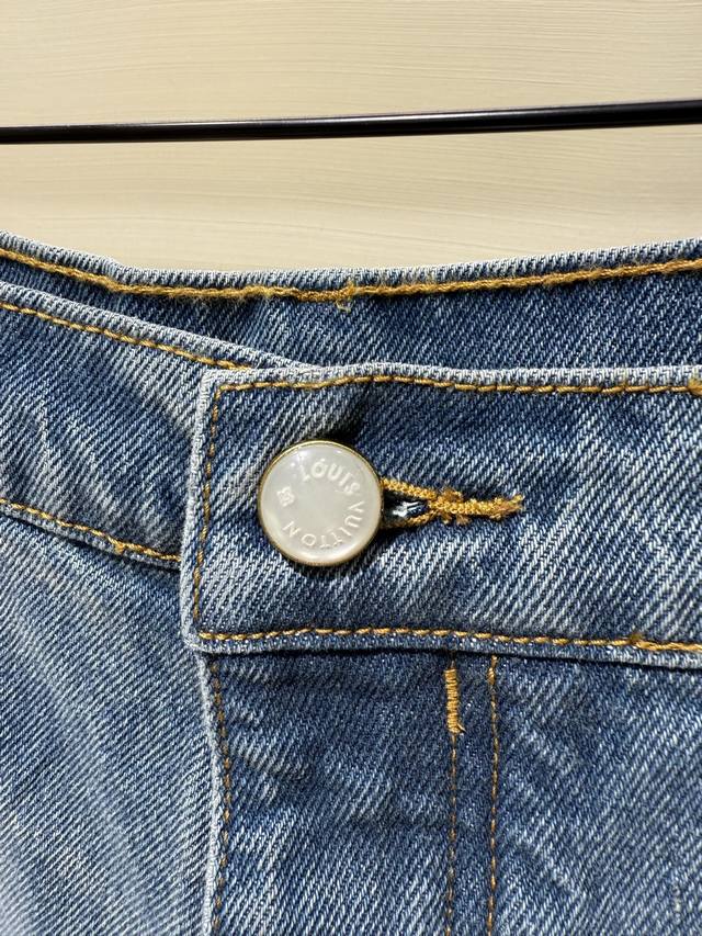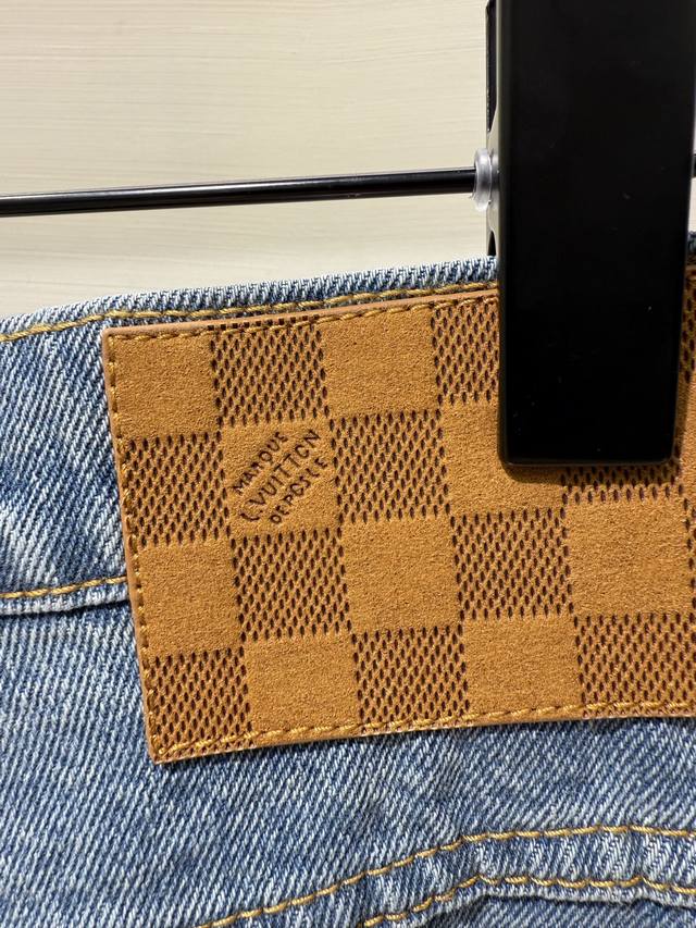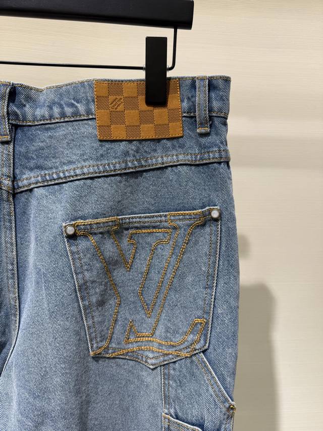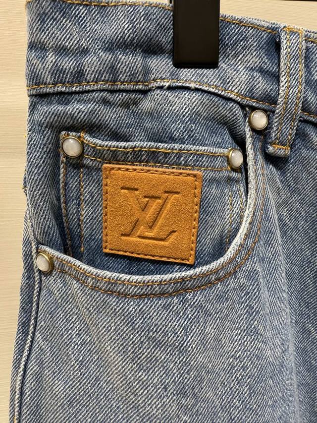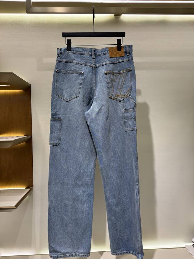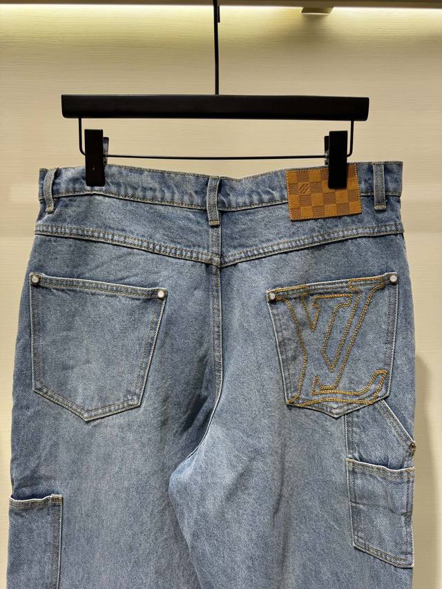 Lv Light Blue Washed Cargo Jeans DDD These cargo jeans are a wardrobe staple, crafted from premium Japanese denim and incorporating Louis Vuitton's exquisite craftsmanship. The classic wash tone is complemented by understated topstitching; the Lv logo on the back pocket, suede patchwork, pearlescent buttons, and rivets add subtle touches of sophistication. They can be worn as a set with the matching hoodie. DDD Fabric: Pure Cotton Denim DDD Made from premium pure cotton denim, the fabric ensures classic denim texture, durability, and breathability. The classic wash is achieved through a professional industrial washing process. The washing softens the fabric, eliminating the stiffness of new material; it controls the degree of fading to create a layered vintage blue hue; and it prevents significant shrinkage during the garment's final product. The understated topstitching contrasts with the fabric but isn't overly fussy, highlighting the stitching structure and reinforcing the workwear style. DDD Craftsmanship: Attention to Detail. The back pocket features an LV logo embroidered with topstitching. The chest pocket logo is embroidered using close-stitched, evenly spaced straight lines, creating a refined and extremely durable outline that aligns with the functional attributes of workwear. DDD Suede Logo Patches: High-quality suede is laser-cut and embossed with the brand logo, sewn onto the back of the pants. This adds a luxurious, soft touch, creating a sophisticated contrast with the stiff denim. The ticket pocket features a logo patch, securing the brand's leather logo to this small pocket as a refined identifier. DDD Pearlescent Buttons and Rivets: Traditional workwear metal hardware is replaced with buttons featuring a warm, pearlescent effect. This enhances the garment's refinement and uniqueness while retaining the functional reinforcement of rivets. DDD Functional Workwear Structure: The workwear silhouette and double-layered knee structure embody functionality. The double-layered knees, achieved by overlaying a layer of matching denim on the outside of the knee and reinforcing the stitching, significantly enhance the durability of this high-wear area, a signature design element of workwear and vintage jeans. The classic five-pocket design includes a front slanted slip pocket, a back patch pocket, and a right front receipt pocket, providing classic and practical storage solutions. Sizes: 28 30 32 34 (Ddd 2228082)