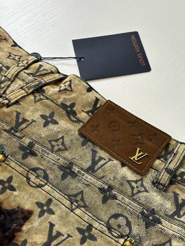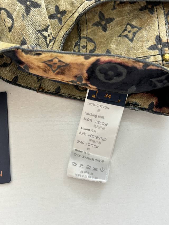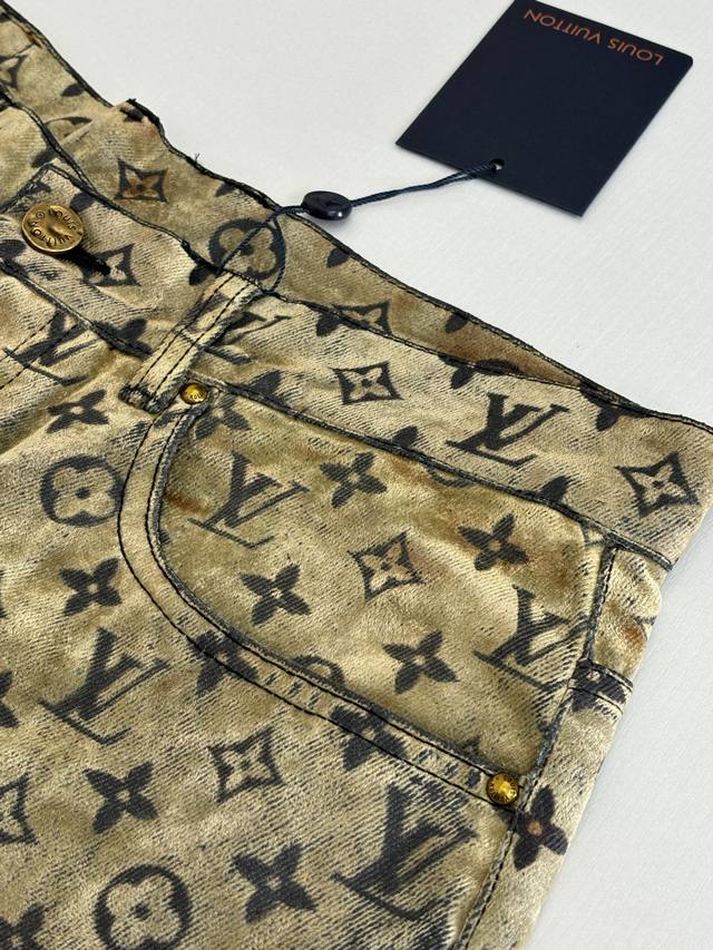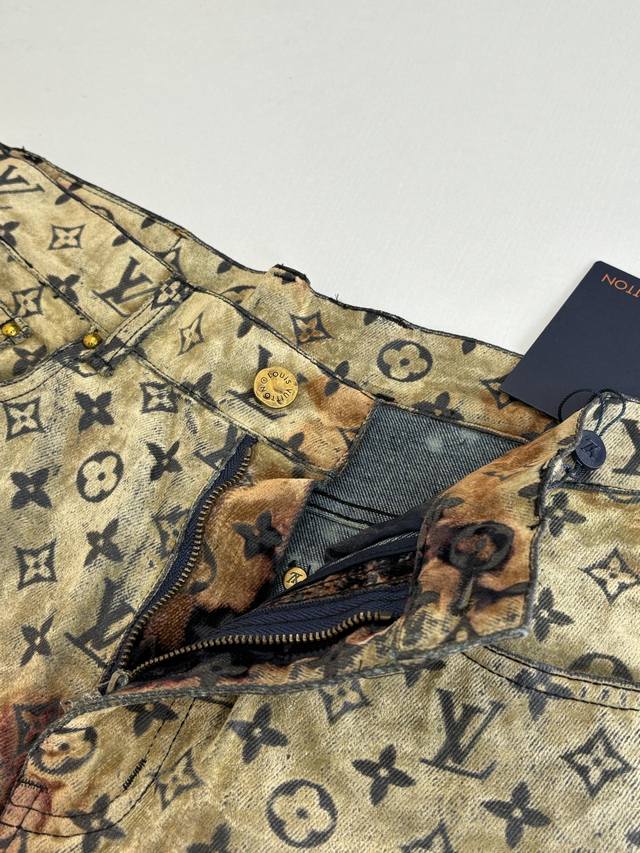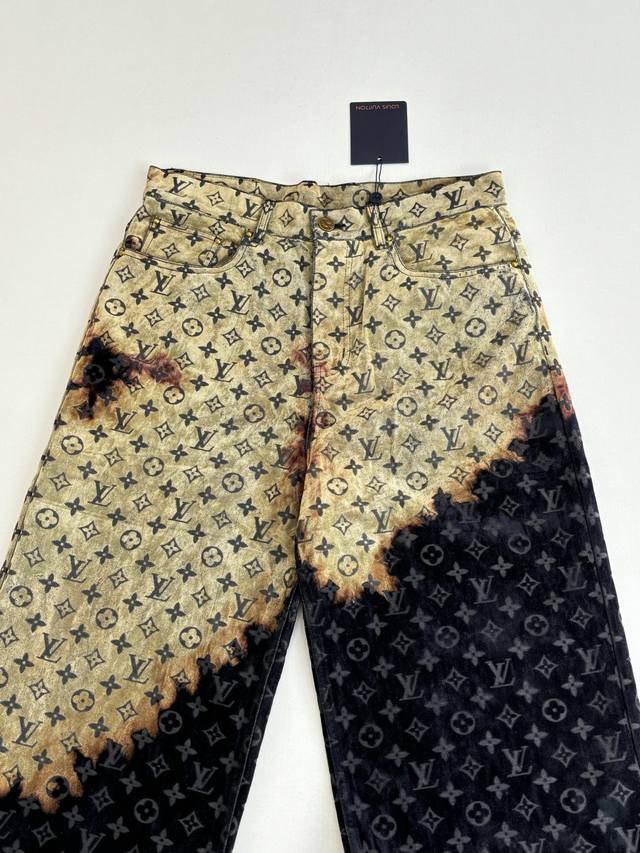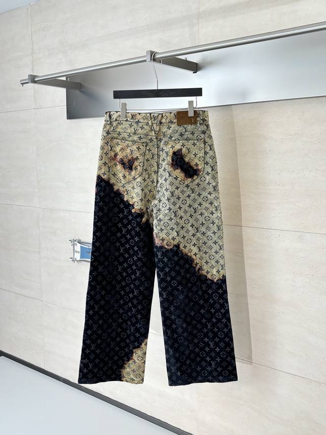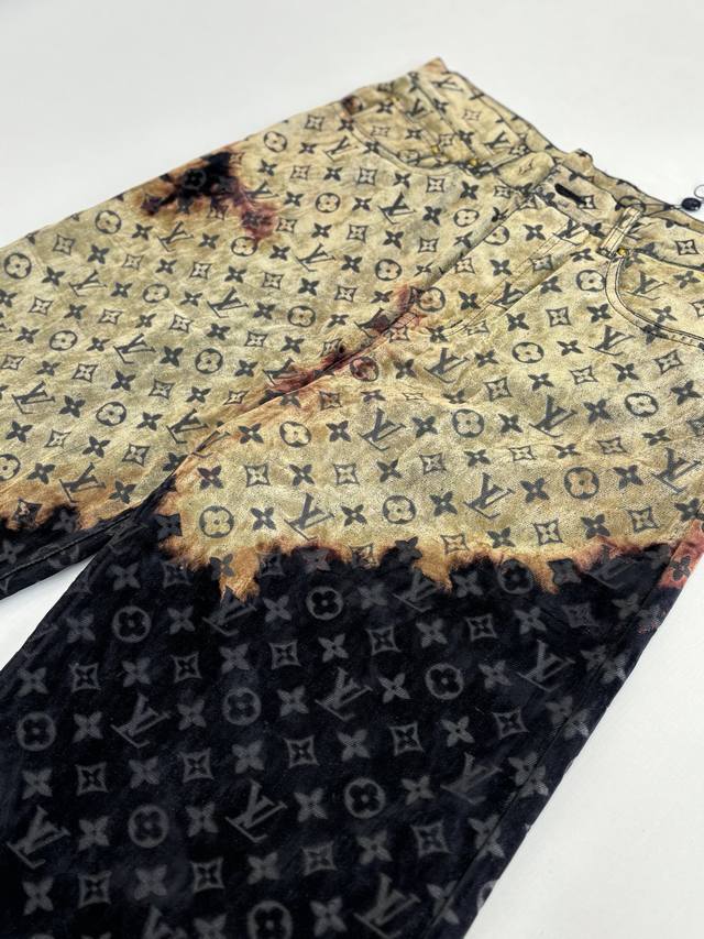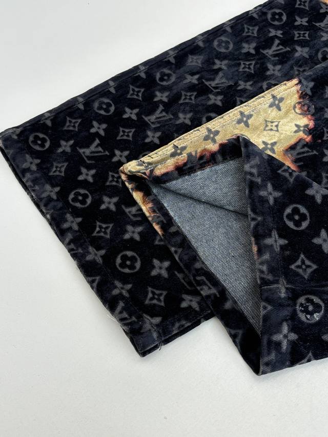 LV Louis 24Ss Fiery Cloud Campfire Flocked Denim Pants (DDD) Originally purchased for 28,000, these are jacquard flocked denim fabrics with a twill weave. The fabric is thick, with a clear twill texture and well-treated patterns. The fabric is made using custom-dyed yarns for flocking, featuring a classic monogram pattern across the entire fabric. The entire garment is cut using infrared laser positioning, with the main body meticulously hand-cut for pattern alignment, and the cut pieces are then individually aligned and positioned. The entire fabric is secured with single-needle embroidery using thick horizontal threads. High-standard sewing and pattern alignment are achieved at the waistband, pockets, and other areas. Multiple processes were exclusively developed and customized, resulting in significant fabric waste. Each piece is hand-painted by experienced washers using gauze dipped in acrylic paint, evenly applied to the flocked surface according to the original pattern, controlling the dyeing time. This results in a very high scrap rate, ensuring each piece presents a unique fiery cloud effect ( DDD). Sizes: 30 32 34 36 (DDD)