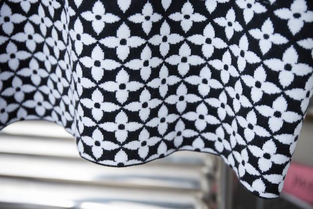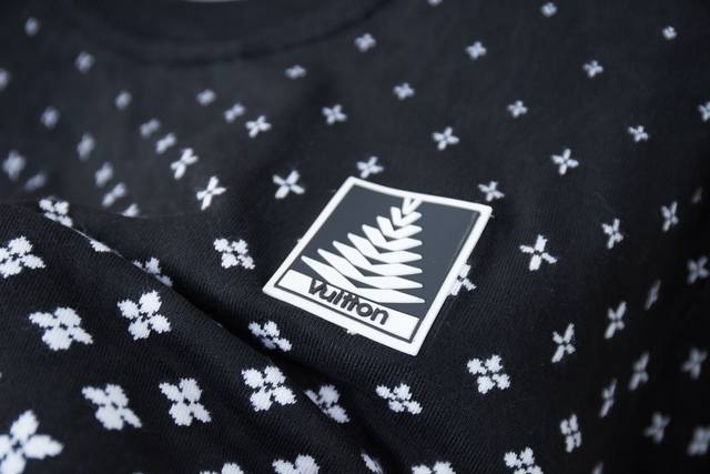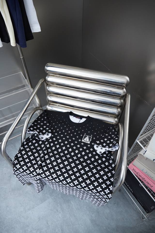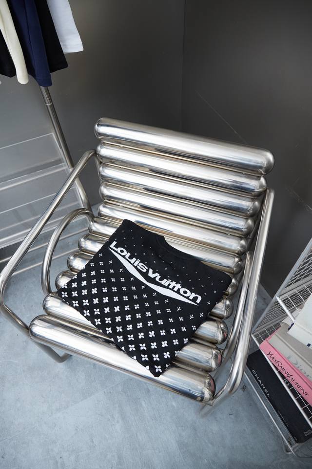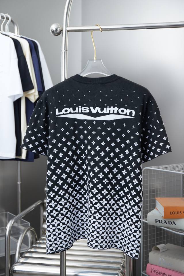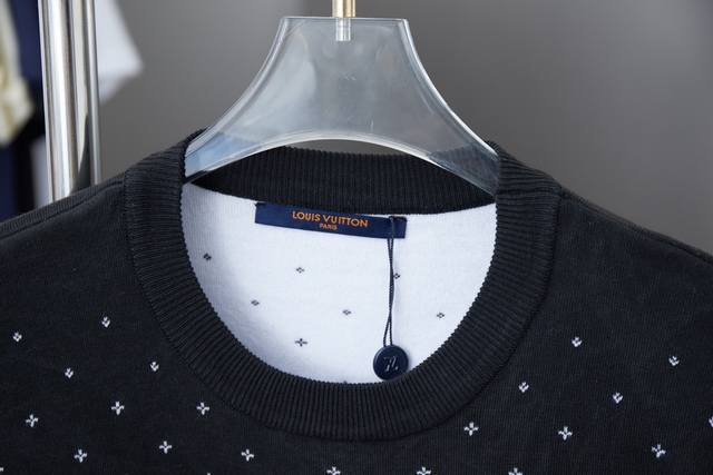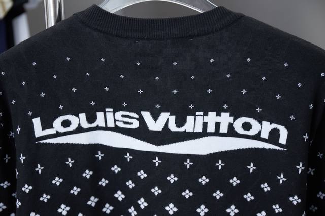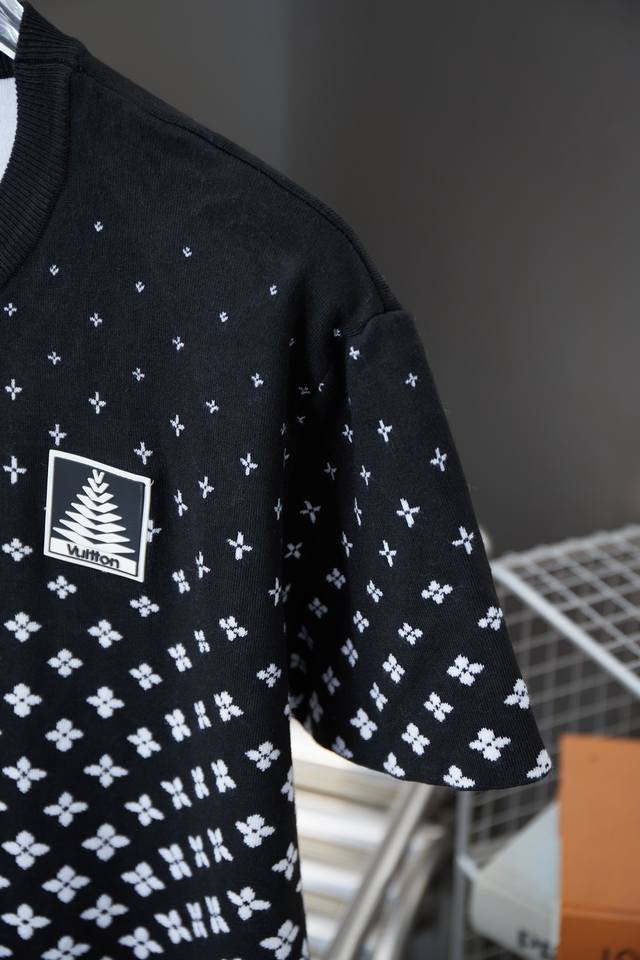 Lv Louis 25Ss new cotton T-shirt features an intricate jacquard knit with a gradient snowflower pattern, creating a magnificent scene of falling snowflakes against a vibrant background. Lv Fir Tree patches and the Louis Vuitton logo adorn the front and back.
