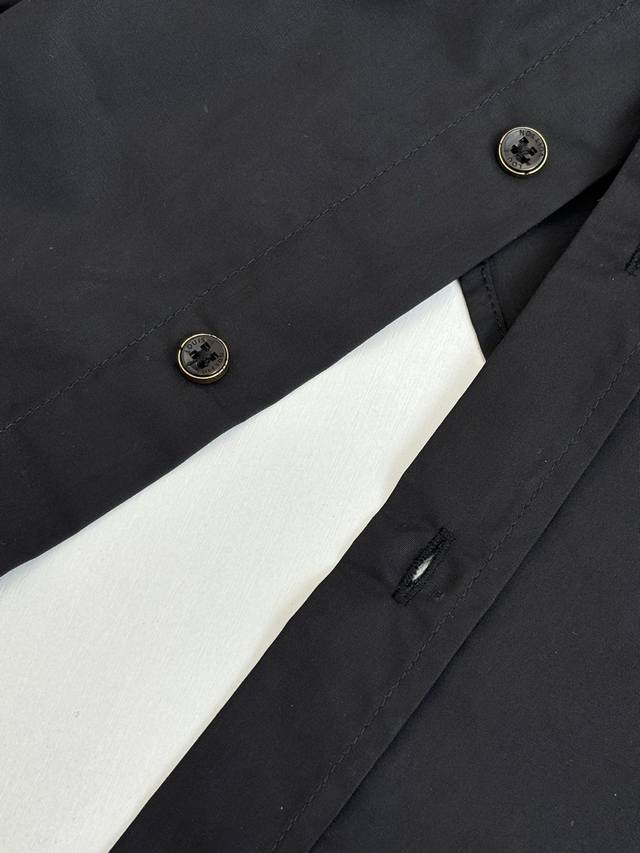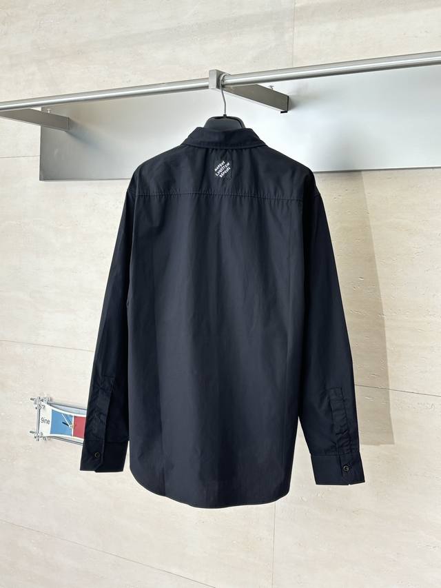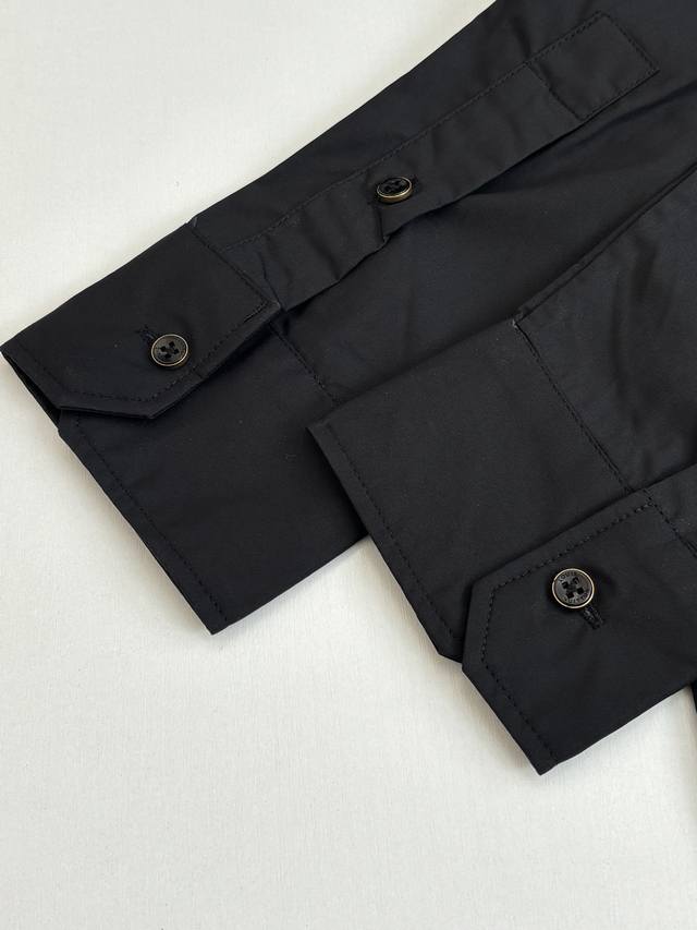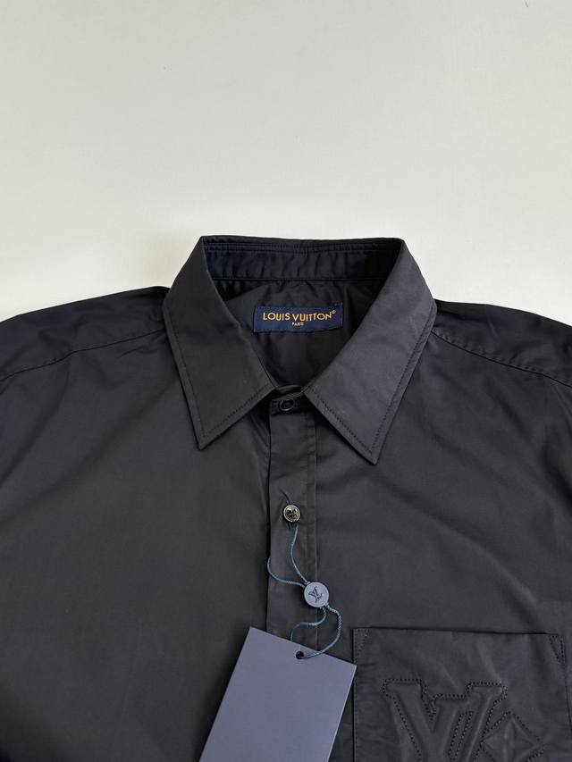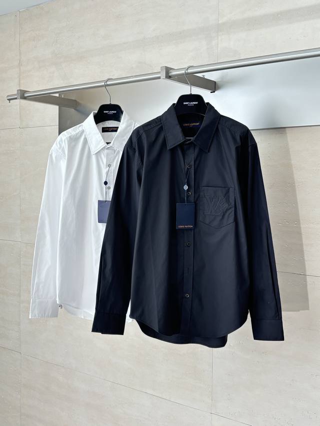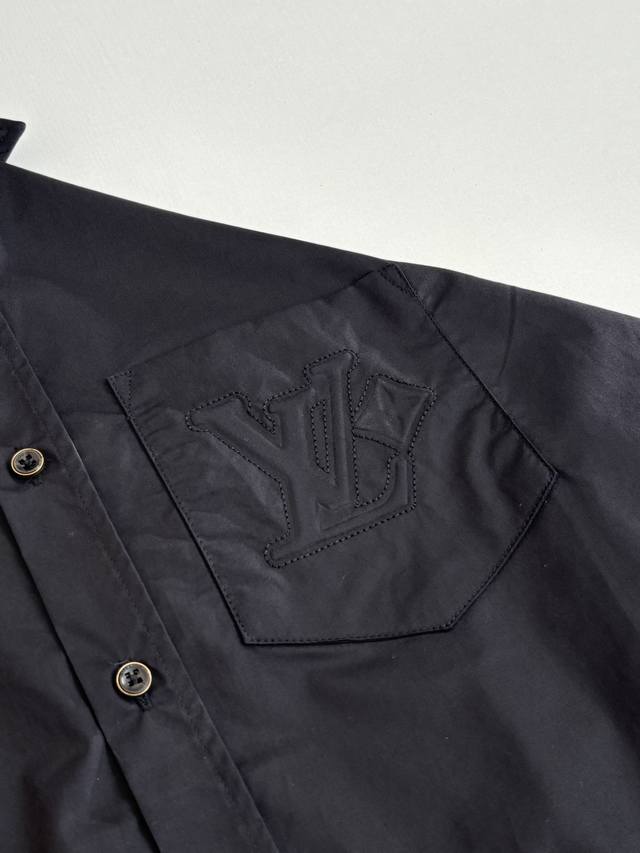 LV Louis Embroidered Pocket Collar Long-Sleeve Shirt DDD The fabric has a distinct twill weave on the front, while the reverse side is less defined. Both warp and weft are made of single yarn with similar linear density; the warp density is slightly higher than the weft density, resulting in a soft hand feel. The fabric has excellent stability, is not easily deformed, and prevents bulging. Cotton fibers have good moisture absorption, keeping the fabric in a moisture balance, providing comfort and adding to its refinement. The embossing process involves heating and setting the upper and lower molds, then pressing the fabric with rollers at a specific temperature to create a three-dimensional raised surface through mechanical imprinting. This process produces a three-dimensional effect with a relief style and a special glossy finish, resulting in a strong three-dimensional feel for the created patterns and text, adding a decorative art effect, with clear layers, condensed three-dimensional images, and accurate perspective. The collar is adjustable with buttons, balancing formality and comfort. The back pleats and straps are classic shirt details; the pleats provide extra room for movement, while the straps maintain the shirt's shape when hanging. Custom-made buttons on the front ensure both functionality and a crisp silhouette. The overall stitching is straight and delicate, the fabric is soft and comfortable, and the consistent color allows for easy pairing with other shirts for a stylish look, suitable for various occasions. Custom accessories are included, and all tags are present. Unisex! Sizes: S, M, L, XL