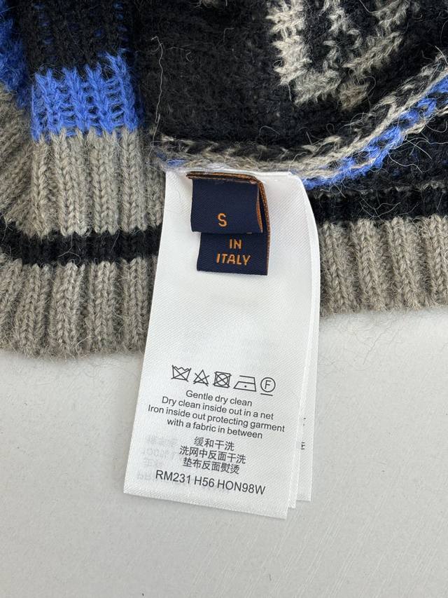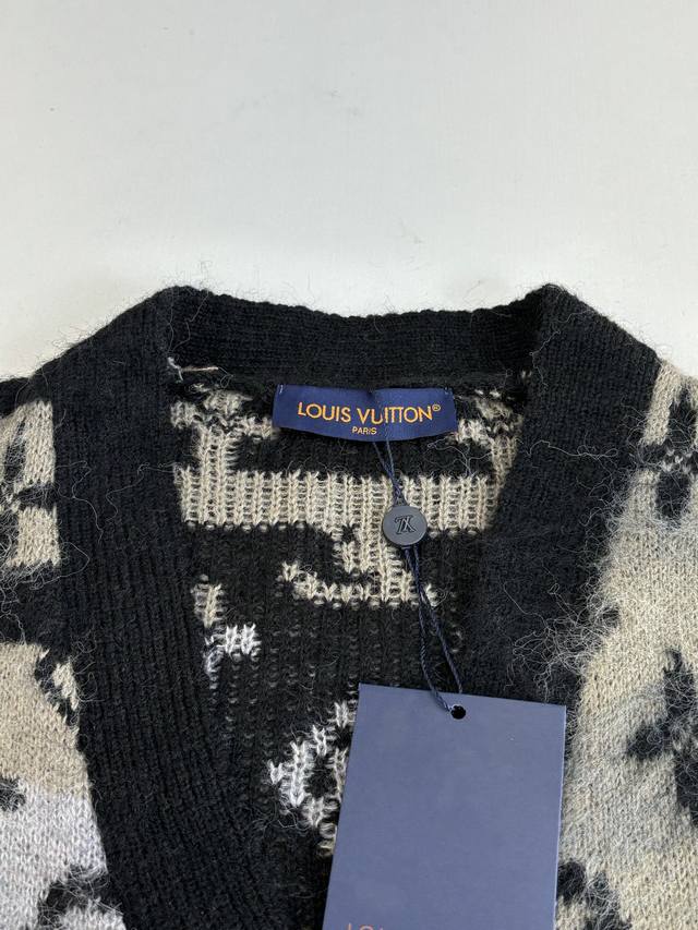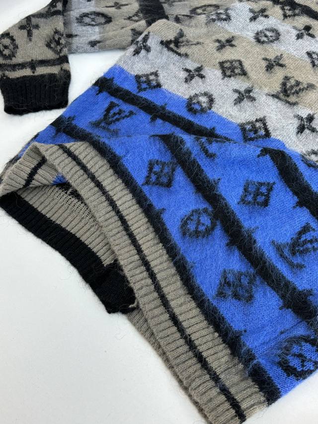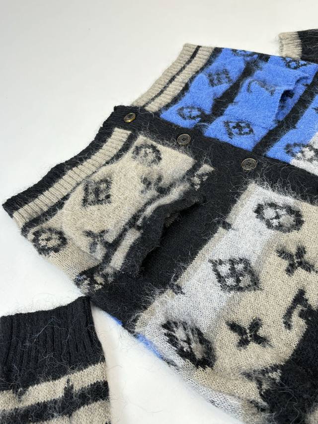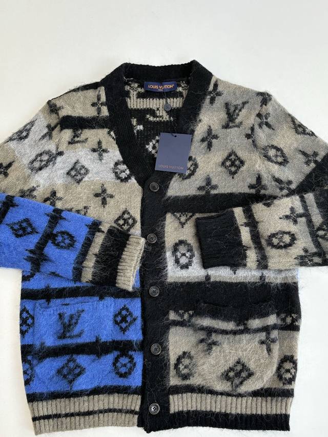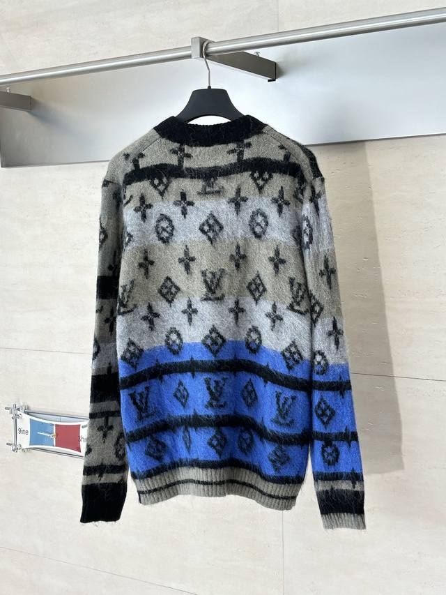 LV Louis Gradient Blue Mohair Knit Jacquard Cardigan DDD. The fabric is made of custom-woven mohair, 78% nylon, 12% sheep's wool, and 10% yarn. The original design features finely striped mohair. This cardigan uses a finely brushed mohair blend to create a rich texture, while the full-width Monogram pattern adds visual impact. It can be paired with casual or formal trousers to showcase a sophisticated style. The mohair undergoes a natural shrinking process after washing. After the cardigan is knitted, the loose threads are manually removed, knotted, and sewn together. After sewing, it is washed and initially ironed to set the shape. Then, the clips are removed, and the fibers are gathered. After gathering, it is washed again, and finally gathered once more to achieve the same feel and effect as the original design. The process is very complex. Original mold, engraved 4-hole brand logo, painted black metal buckle. Laser engraved brand logo. This cardigan is made of rich, finely brushed mohair, with an elegant color scheme highlighting the full LV Monogram pattern. It is comfortable and warm to wear and can be paired with simple casual trousers or dress trousers to create a classic and sophisticated look. Size: SML
