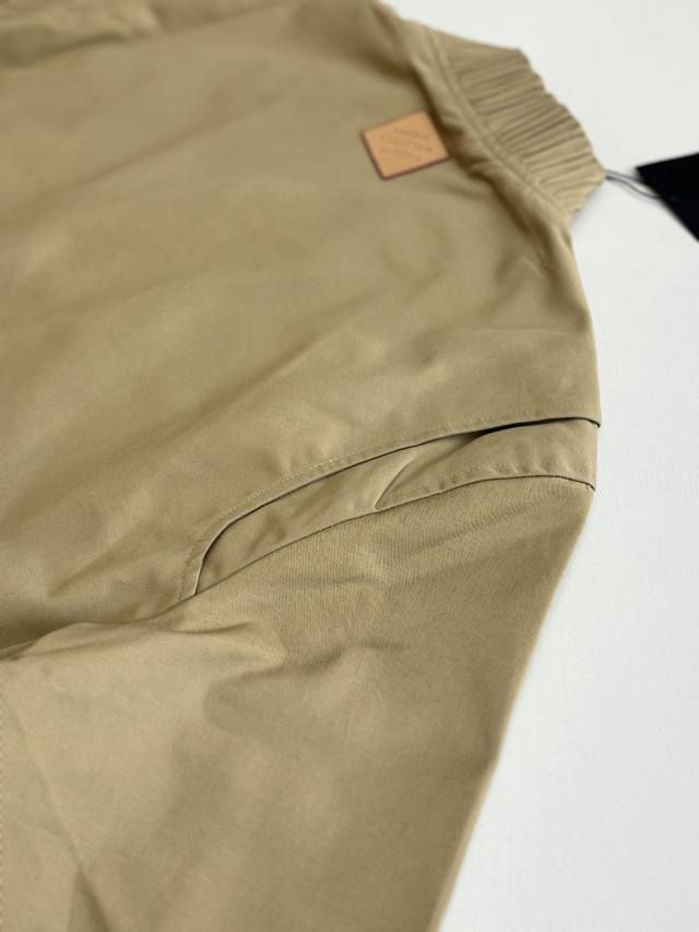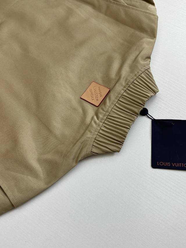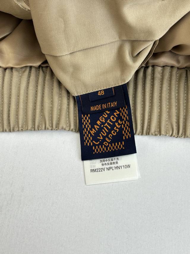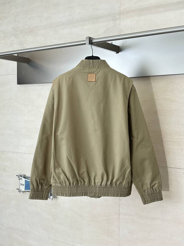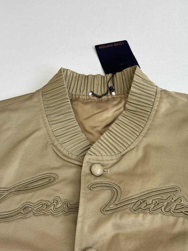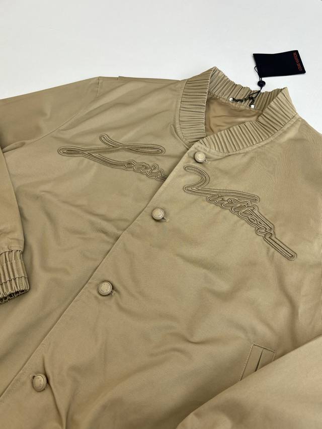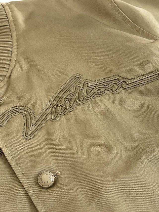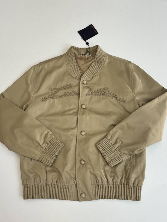 LV Louis Ss24 Solid Color Twill Embroidered Logo Bomber Jacket DDD. The fabric is custom-dyed 100% cotton twill fabric (Yb), not readily available from the market. The front panel features an octagonal machine screen embroidery print with the logo lettering. The jacket is made from individual pieces, with the shoulder seams, back collar, and hem all hand-cut. Matching glossy finish with hand-sewn logo lettering. Buttons are custom-made and in the same color family as the Yb jacket. Features metal back-studded buttons. Unisex style! DDD Size: SML XL DDD