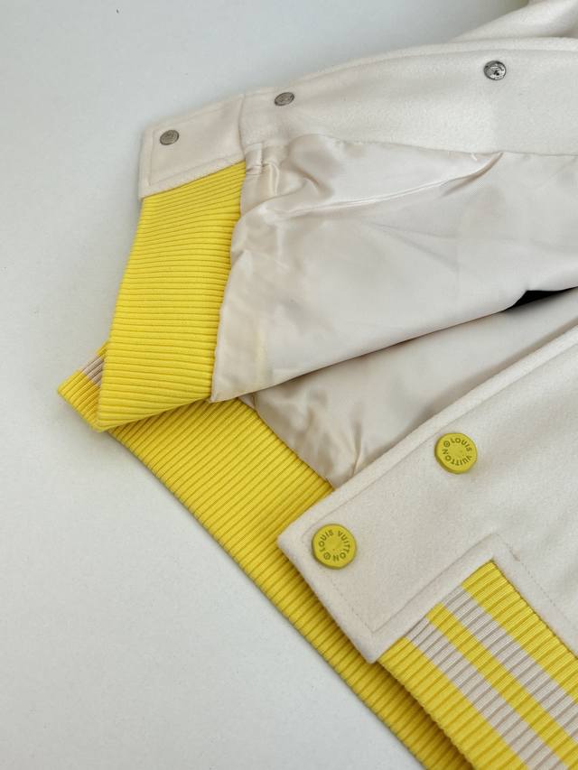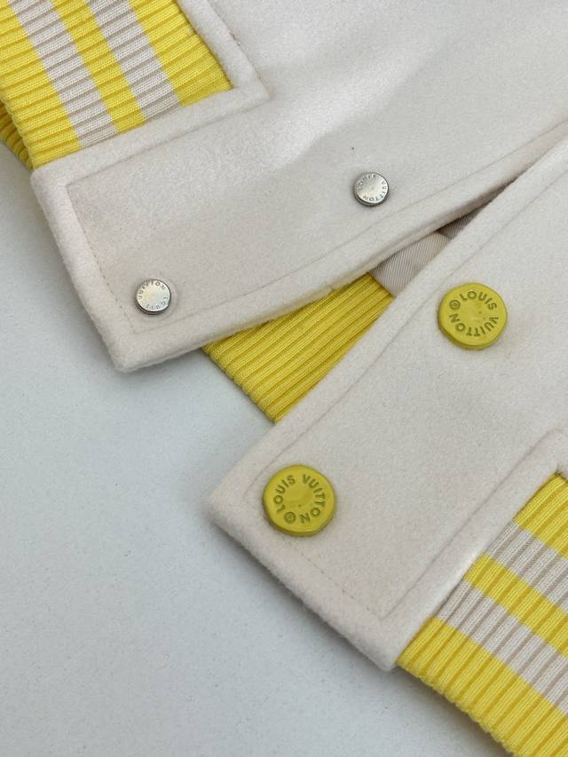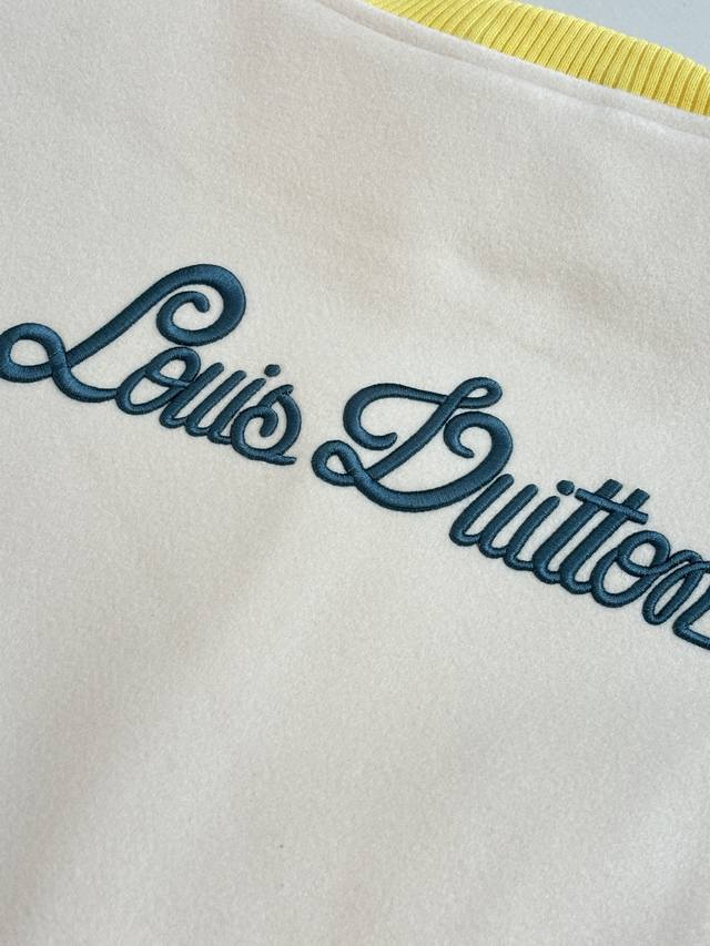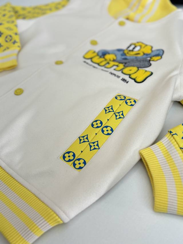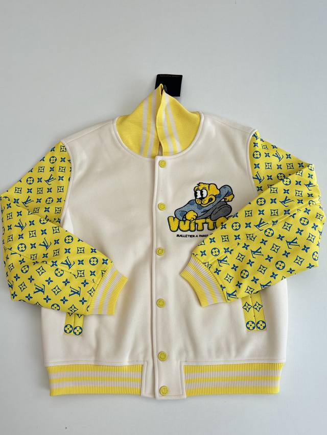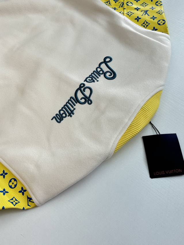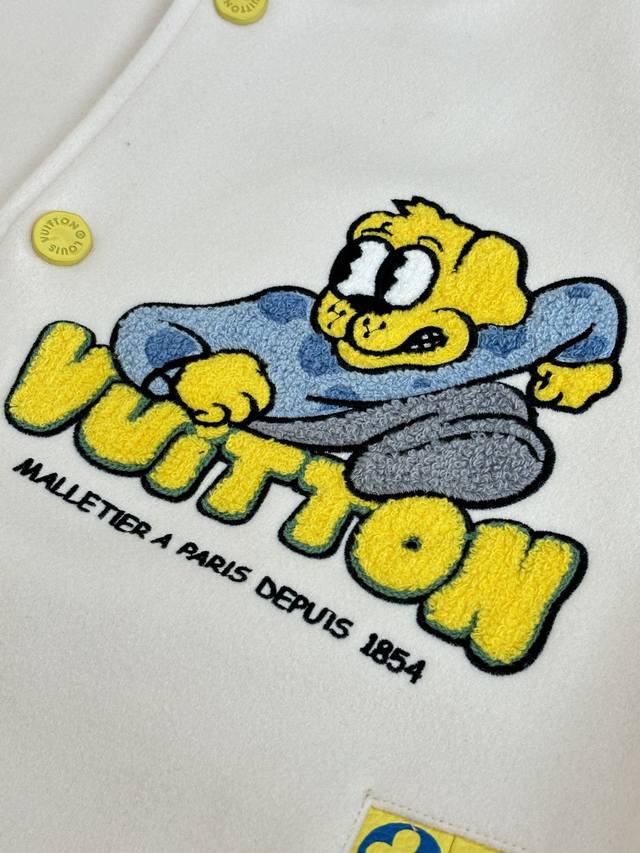 LV Louis Vuitton 23Ss Polka Dot Dog All-Over Embroidered Leather Sleeve Baseball Jacket (DDD) This jacket features a sheepskin body paired with imported calfskin leather sleeves, adorned with the Louis Vuitton Monogram pattern for a subtle, three-dimensional texture. The front is decorated with a polka dot dog pattern, using a combination of terry stitch embroidery and cotton thread flat embroidery, with two sets of yarns of different sizes creating a three-dimensional visual effect. The back embroidery employs multiple techniques for exquisite detail. The garment features a cupro and cotton blend lining for enhanced comfort. Details include custom-made aluminum alloy snap buttons with a logo and glossy finish, and a white brass chain at the back collar. The overall design continues the brand's Spring/Summer fashion show's nostalgic reminiscence of childlike fun, with Louis Vuitton logo and cartoon character embroidered patches adding a lively touch. (DDD Size: SML XL)