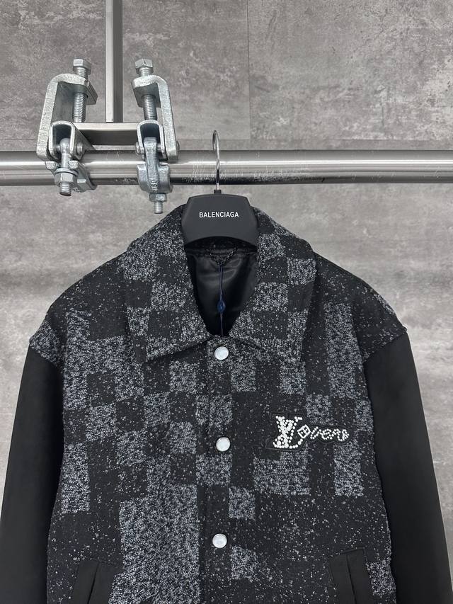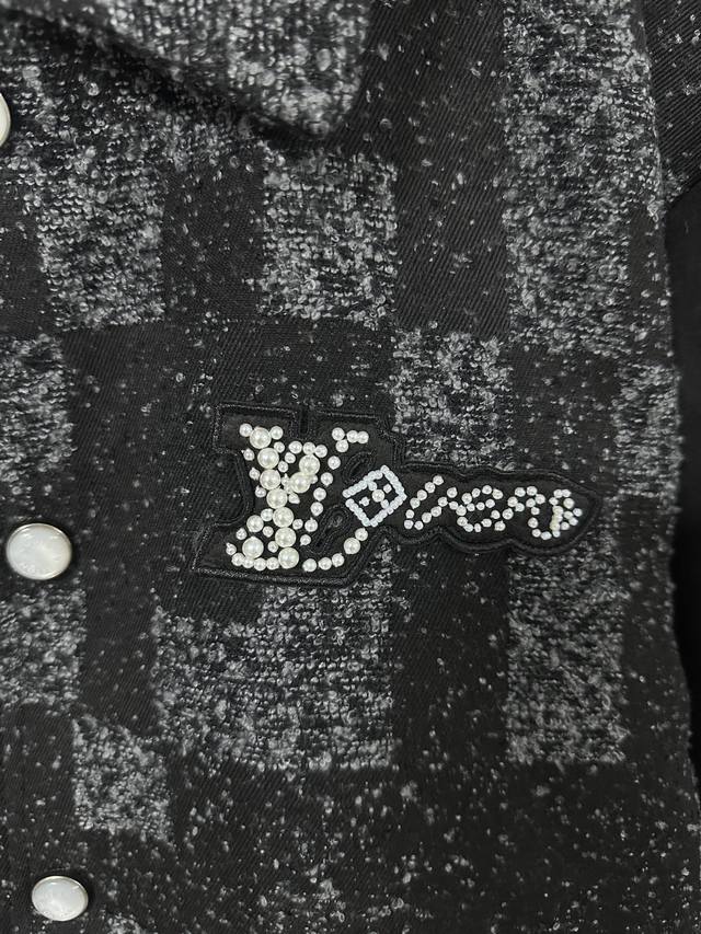 Lv Louis Vuitton 25Ss New Pearl Checkerboard Mixed Leather Baseball-Style Belt Jacket DDD The pearl leather body is subtly woven with the Damoflage pattern from the 2025 Spring/Summer fashion show, creating a striking style with an elegant cut. Rhinestone and resin beads illuminate the logo patch, complementing the shimmering pearl buttons. Suede leather sleeves and pockets add a touch of softness. Ddd Sizes: 46, 48, 50, 52. DDD