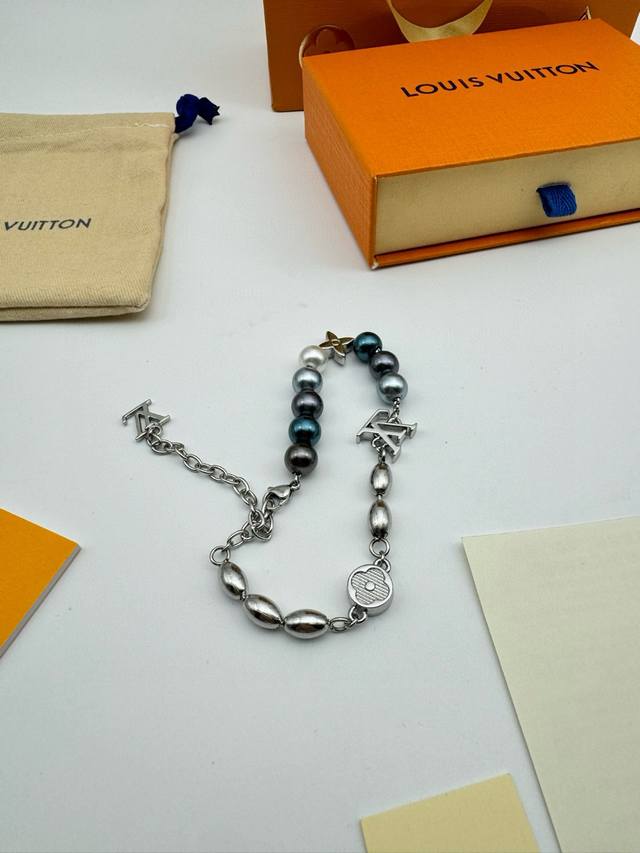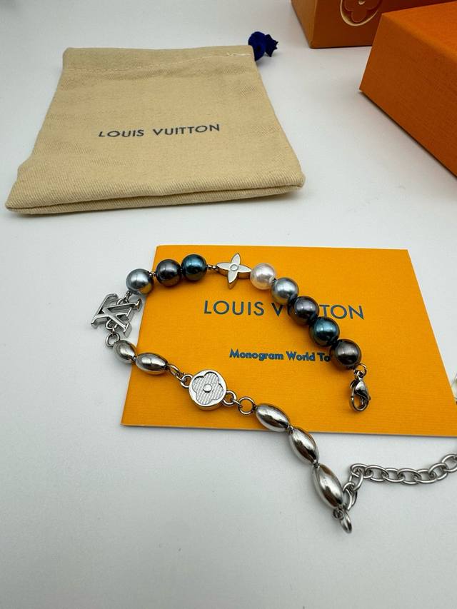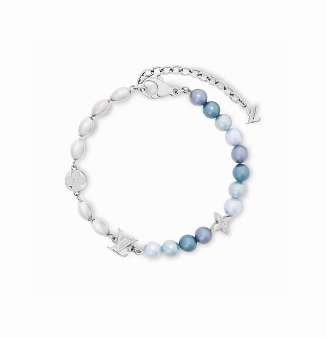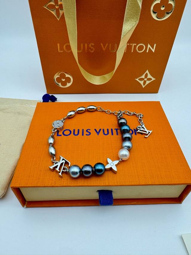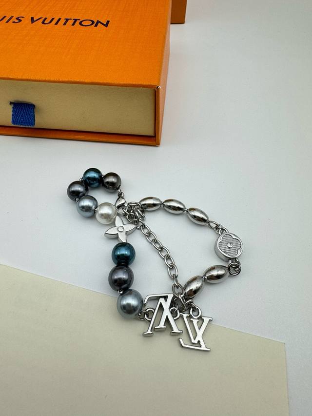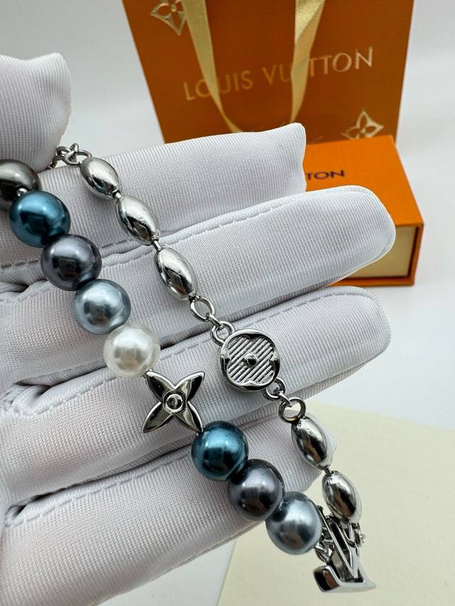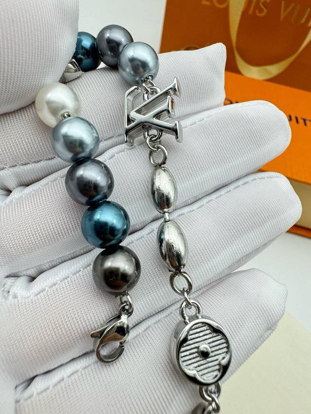 LV Louis Vuitton Blue Pearl Bracelet with Full Packaging DDD This pearls fusion bracelet features a rounded floral logo adorned with metal beads, creating a dual elegance with glass beads. The LV lettering dangles from an adjustable clasp, adding a touch of understated elegance to any everyday look. DDD Metal beads DDD Glass beads DDD Logo embellishment DDD Adjustable clasp DDD