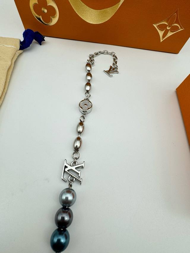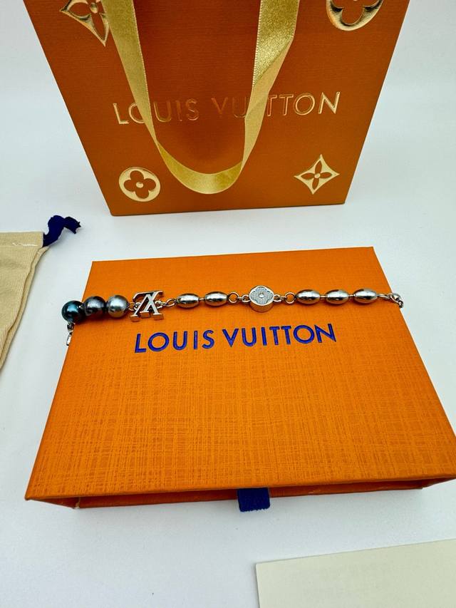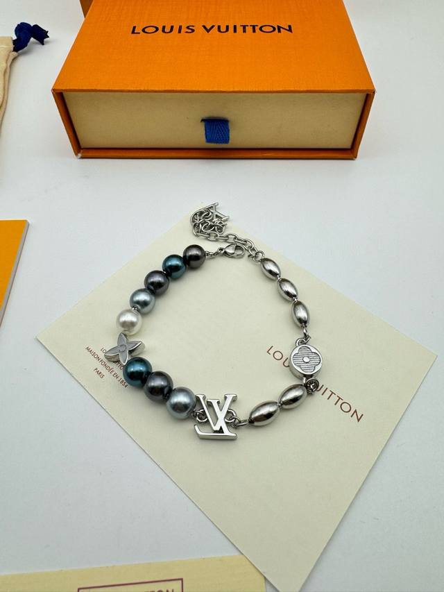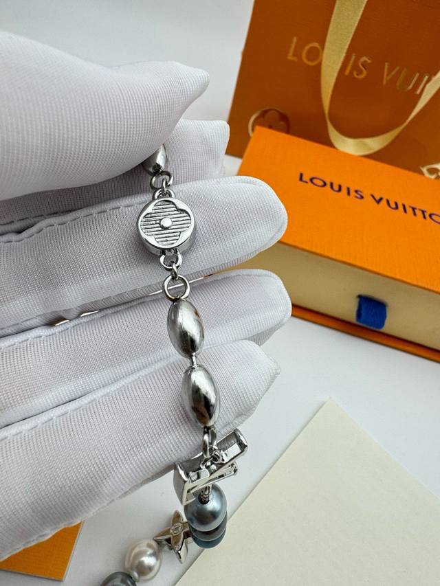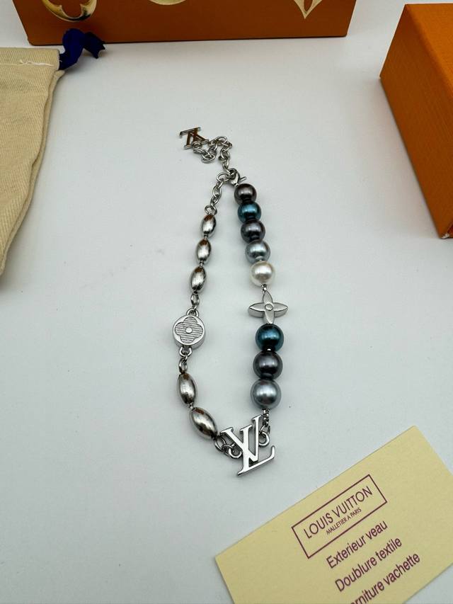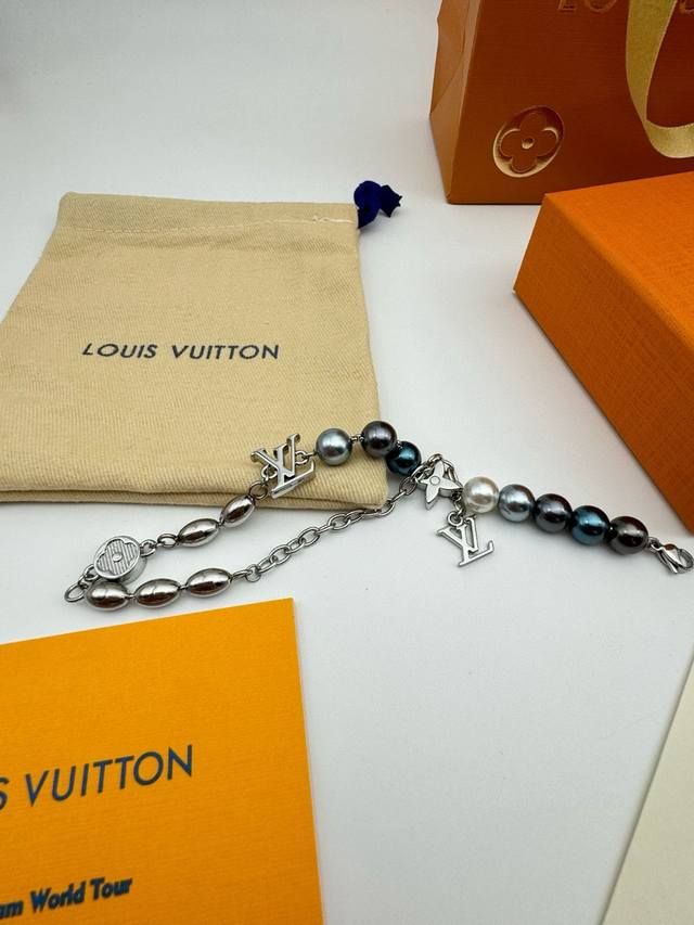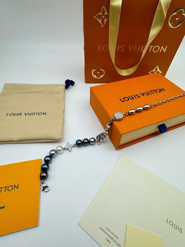 LV Louis Vuitton Blue Pearl Bracelet with Full Packaging DDD This pearls fusion bracelet features a rounded floral logo adorned with metal beads, creating a dual elegance with glass beads. The LV lettering dangles from an adjustable clasp, adding a touch of understated elegance to any everyday look. DDD Metal beads DDD Glass beads DDD Logo embellishment DDD Adjustable clasp DDD