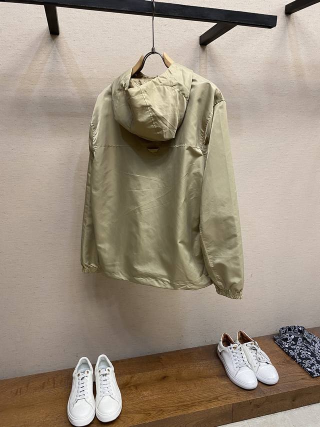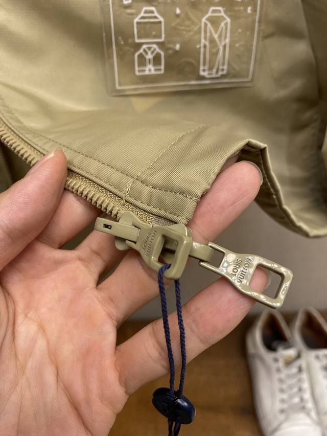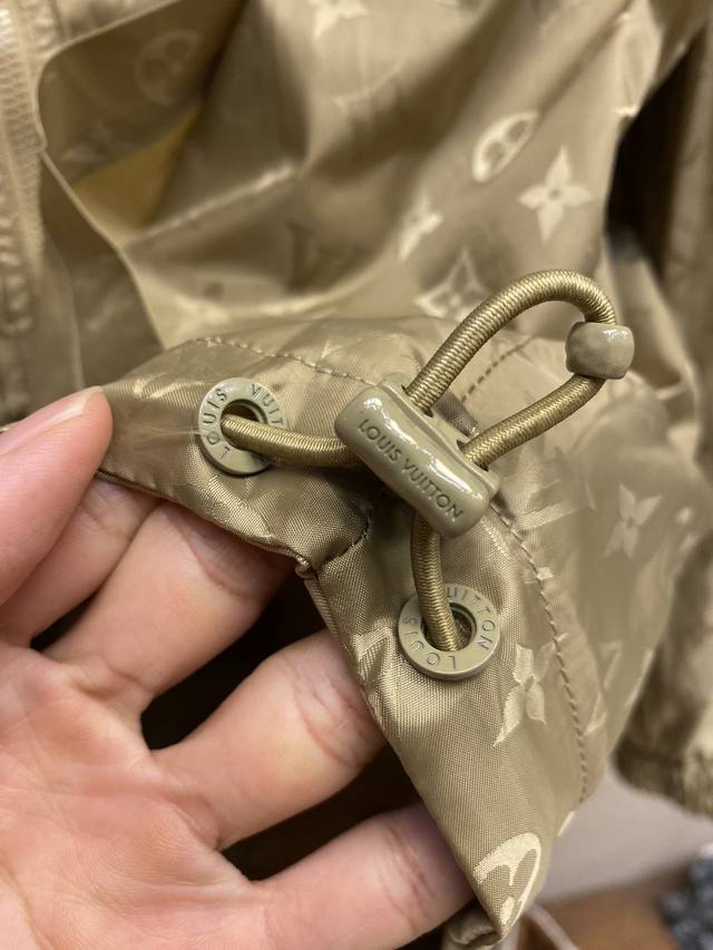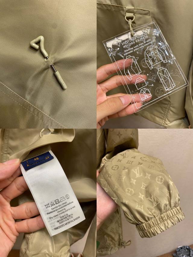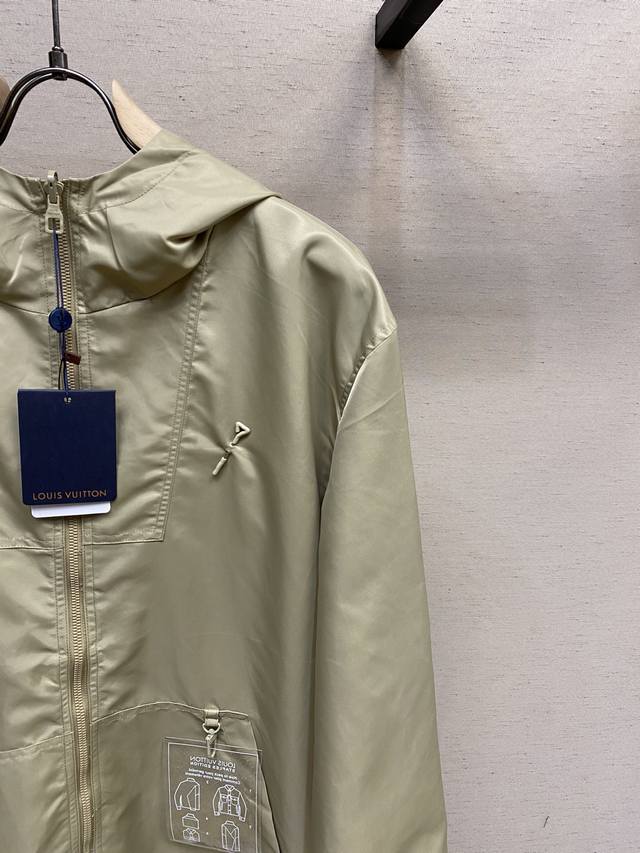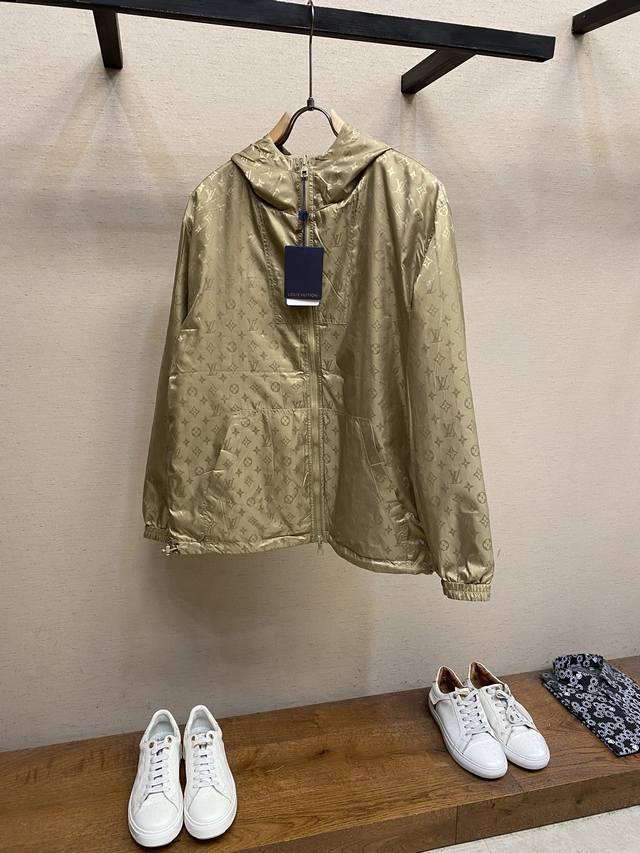 LV Louis Vuitton Early Autumn Monogram Nylon Reversible Hooded Windbreaker/Windbreaker. This windbreaker features a matte, solid-color side with hooks and a pin on the left chest; flipping it over reveals the full Monogram jacquard weave. The water-repellent fabric easily handles changing weather. Washing instructions: Due to the numerous hardware components, dry clean only, medium temperature, and iron on a mat! Sizes: S-XL Colors: Black, Khaki, White