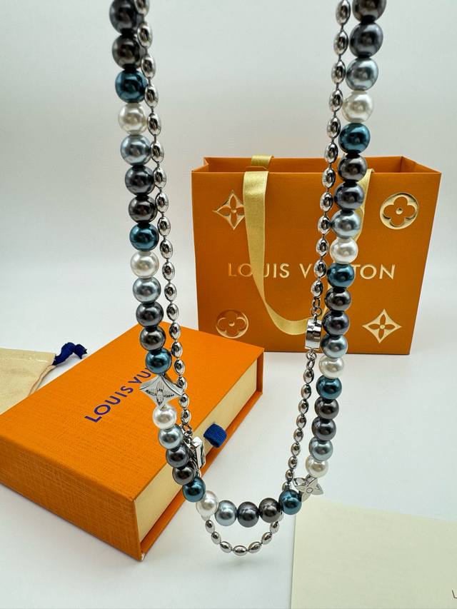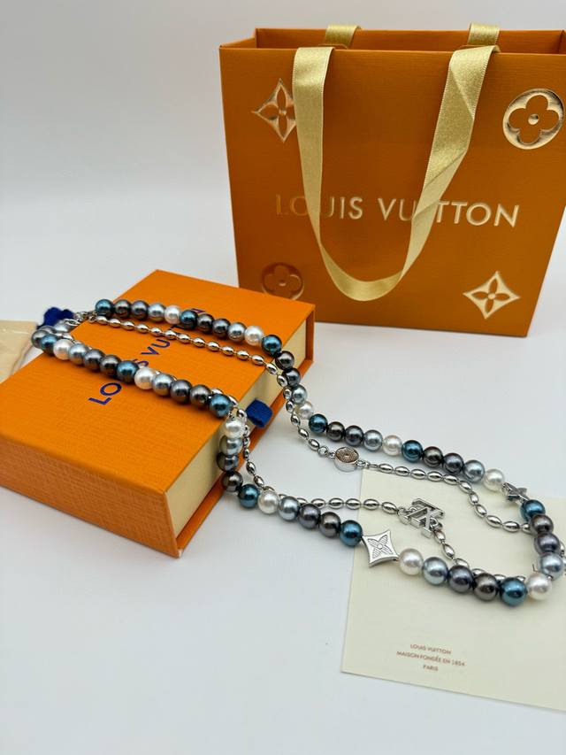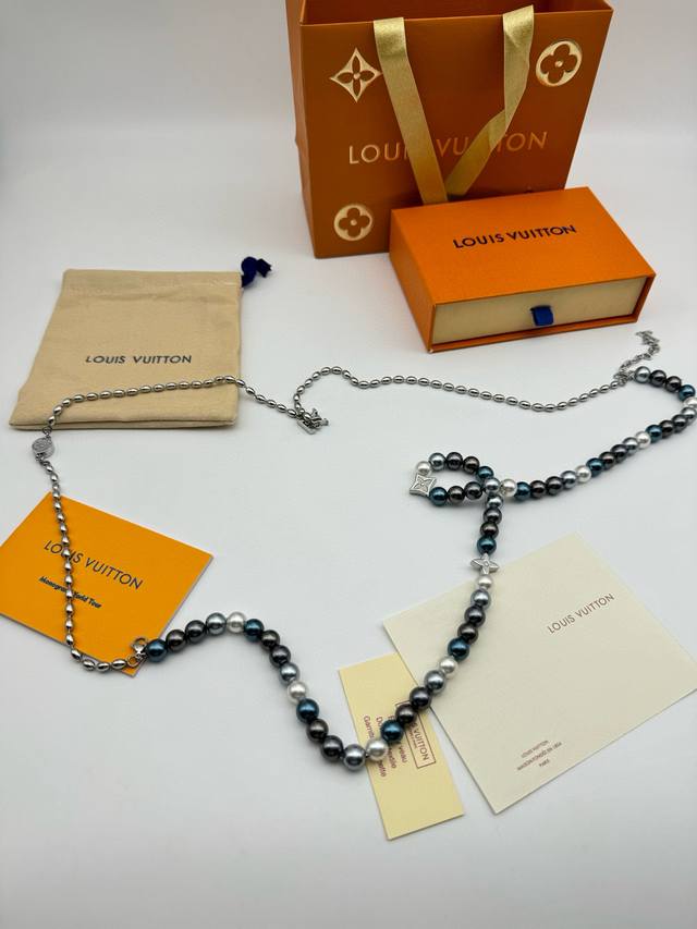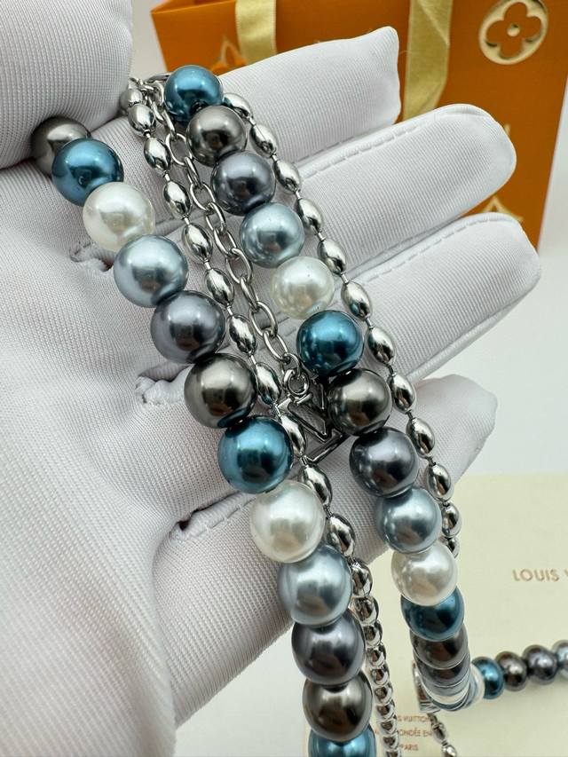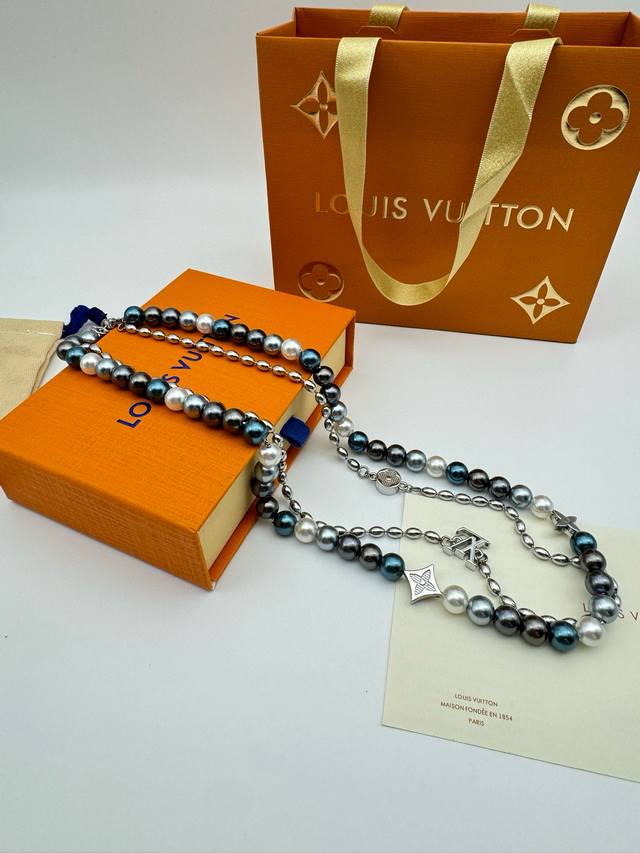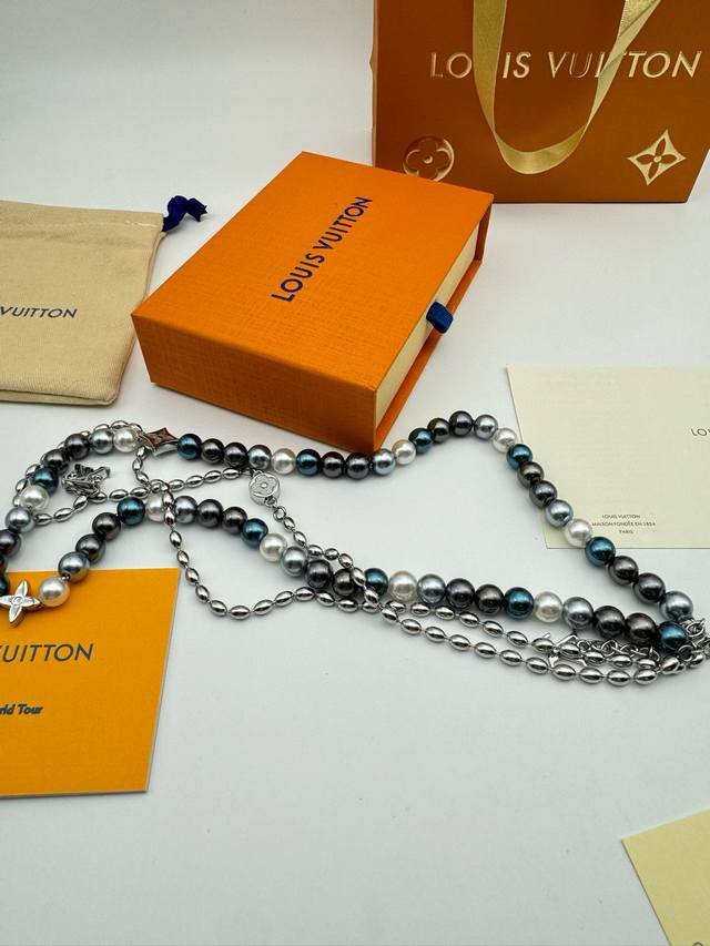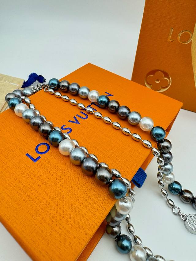 Lv Louis Vuitton Iridescent Blue Pearl Necklace with Complete PackagingThis pear