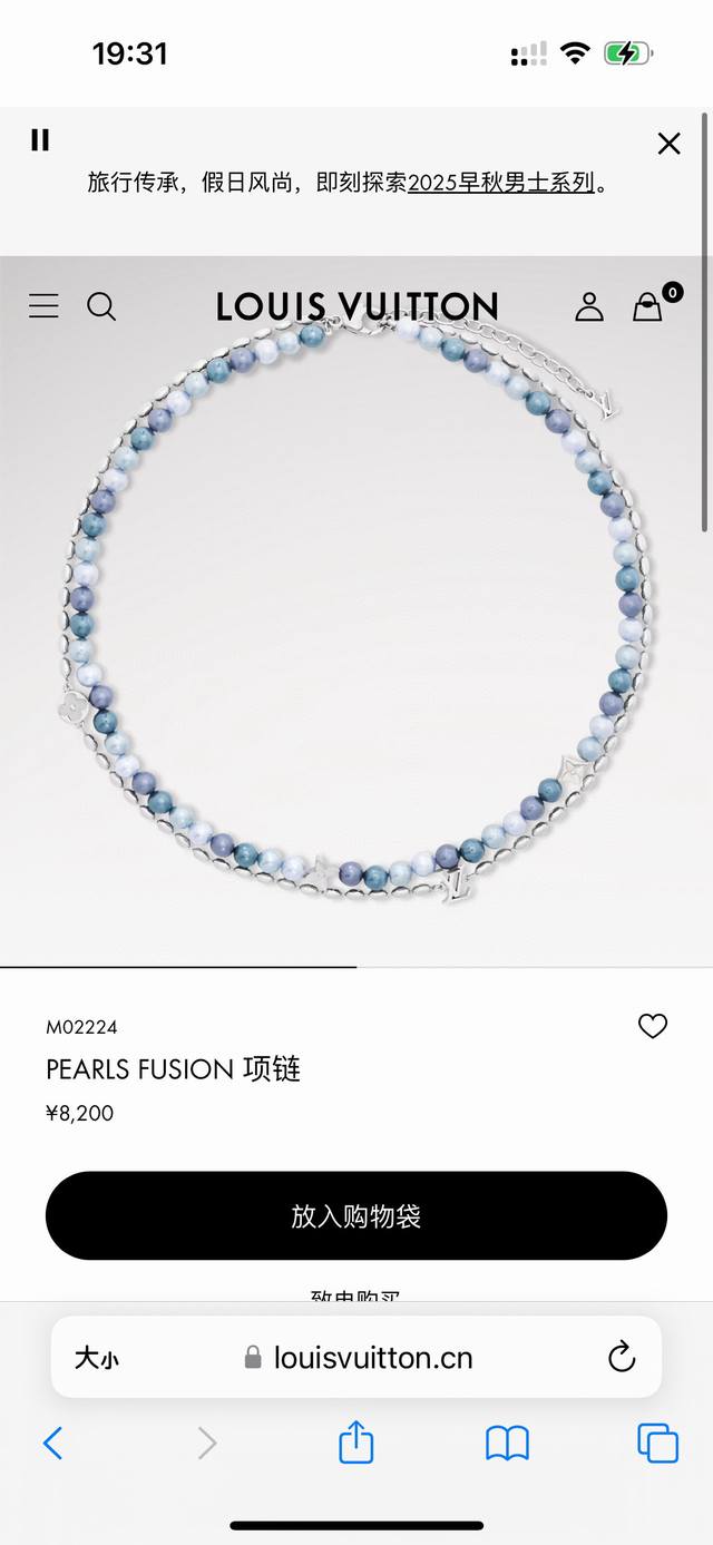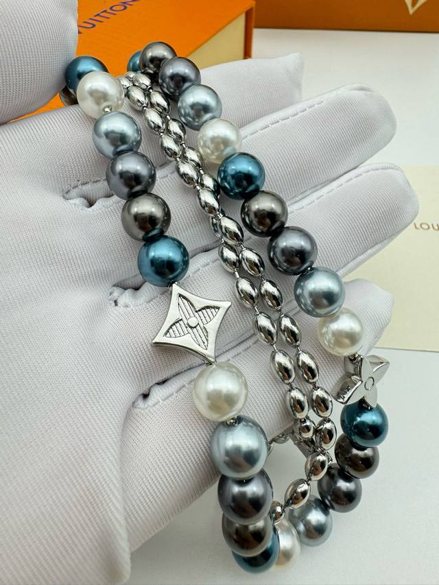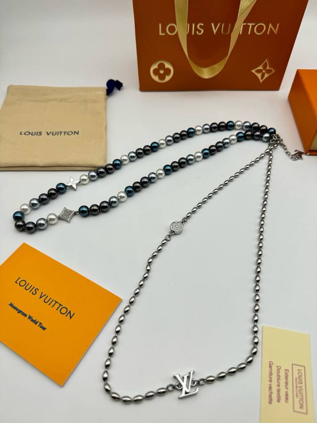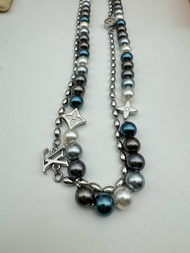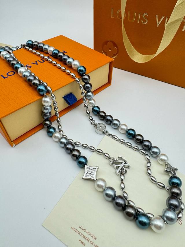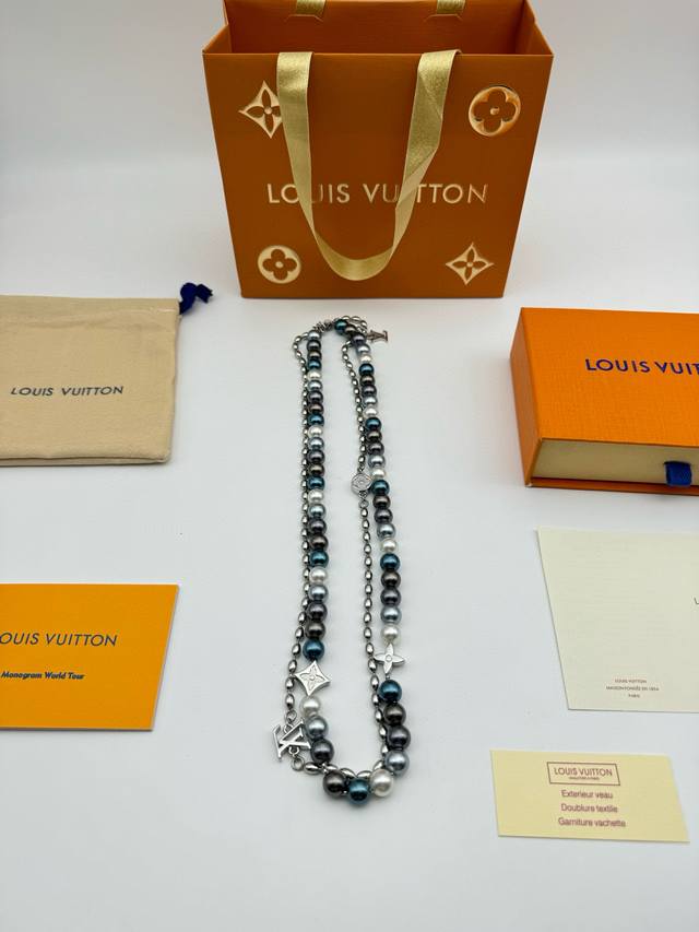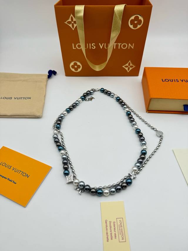 Lv Louis Vuitton Iridescent Blue Pearl Necklace with Complete PackagingThis pear