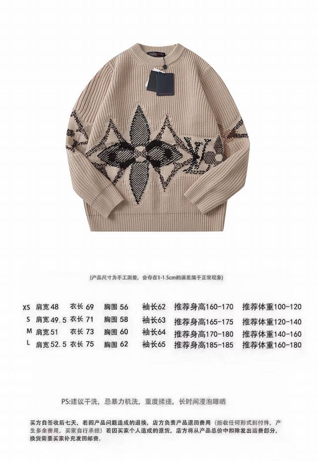 LV Louis Vuitton Ski Collection Pergola Crew Neck Knit Sweater (DDD) Made with the same wool material as the original, emphasizing the brand's sustainability philosophy while ensuring a soft and comfortable wearing experience. The striking Monogram floral pattern blooms on the garment through intarsia jacquard weaving. Ribbed design at the neckline, cuffs, and hem enhances the garment's elasticity, durability, and fit, helping to maintain its shape. The intarsia jacquard weaving technique, a highly complex knitting technique, creates a striking color contrast, a clear pattern, and a seamless three-dimensional effect, showcasing the brand's exquisite manufacturing craftsmanship. Custom-knitted and dyed, with no color difference from the original. Perfectly replicated with meticulous craftsmanship, complete with tags, and custom accessories. (DDD) Sizes: Xs, S, M, L , DDD