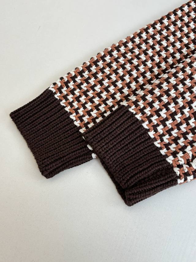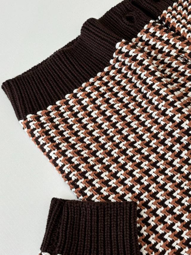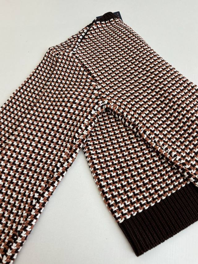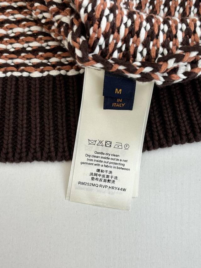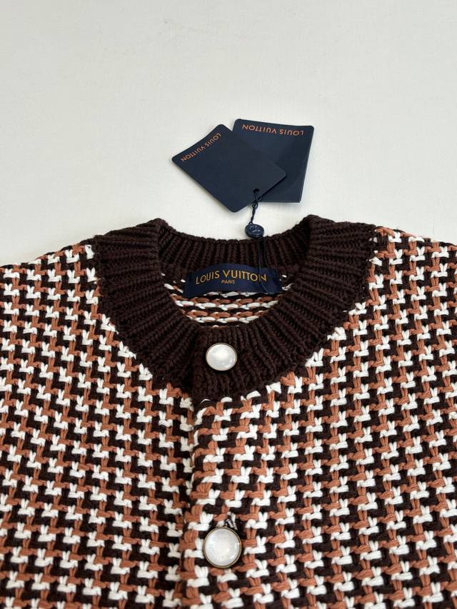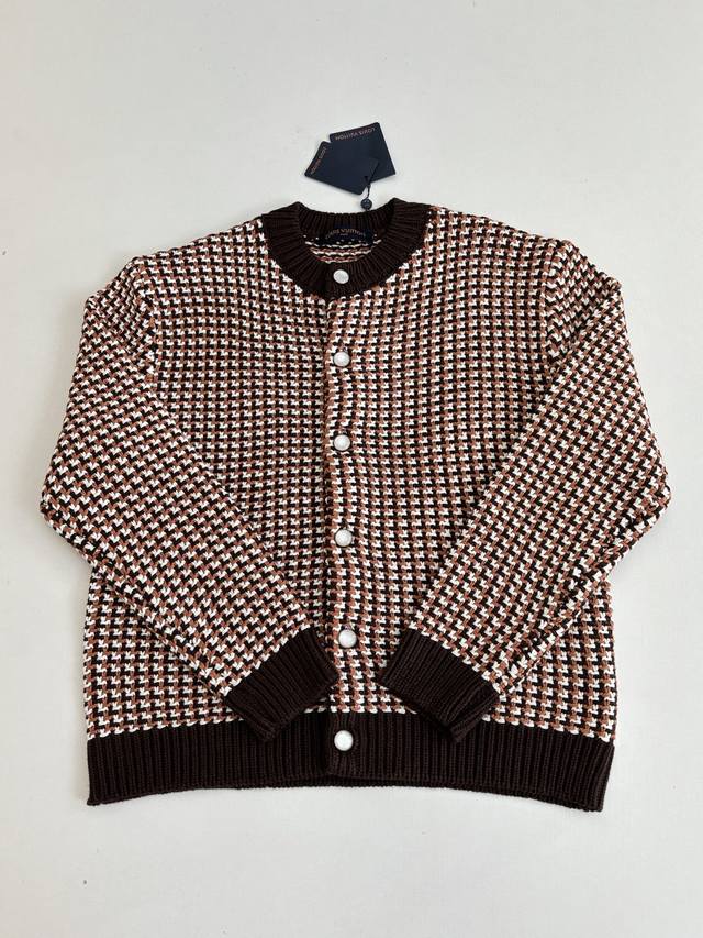 LV Louis Vuitton SS26 New Chunky Knit Jacquard 3D Pilot Check Knit Cardigan DDD. The fabric is 100% cotton wool, with a 100% rayon lining. This cardigan uses custom-dyed wool yarn, with the off-white color matched to the original design. The check pattern is woven using imported machines, creating a 3D jacquard effect. The embroidery features 3D three-dimensional stitching, with the brand's signature embroidery on the chest. The stitch count is approximately 4600 stitches. The buttons are made of natural resin pearls, and the bottom is fitted with a metal base. DDD Size: SML XL DDD
