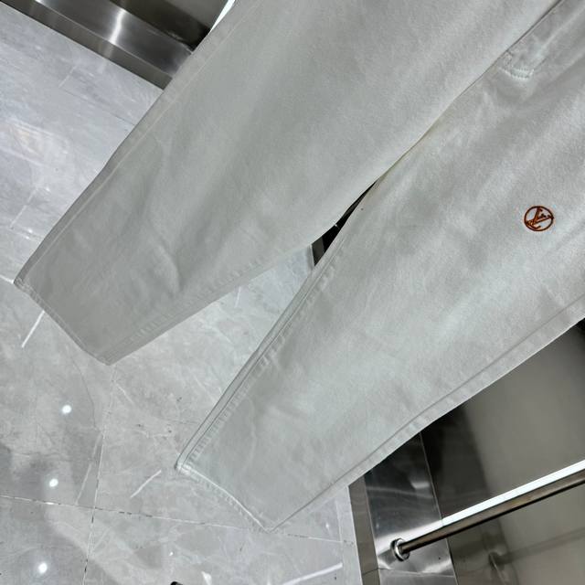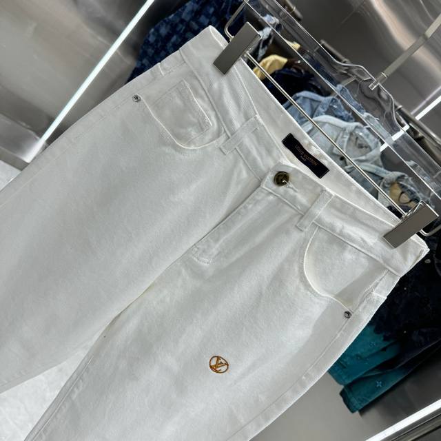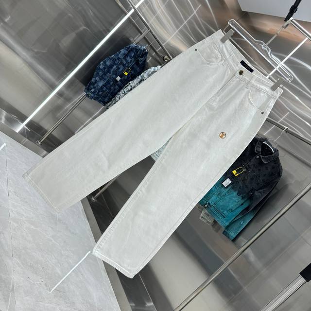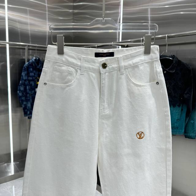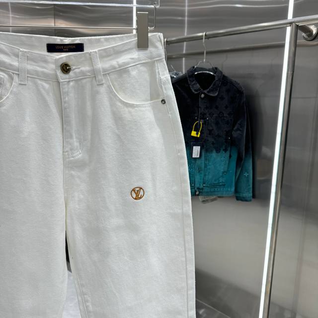 Lv Louis Vuitton straight-leg jeans with letter print on the back pocket. Available in different washes, these jeans are flattering for both slim and thick legs. The straight, slim fit is very flattering and the perfect length is timeless. They're easy to style and a wardrobe essential for various looks! The fabric is firm yet soft against the skin, and the washing process is top-notch. A must-have! Sizes: 28, 30, 32, 34, 36. Color: White.