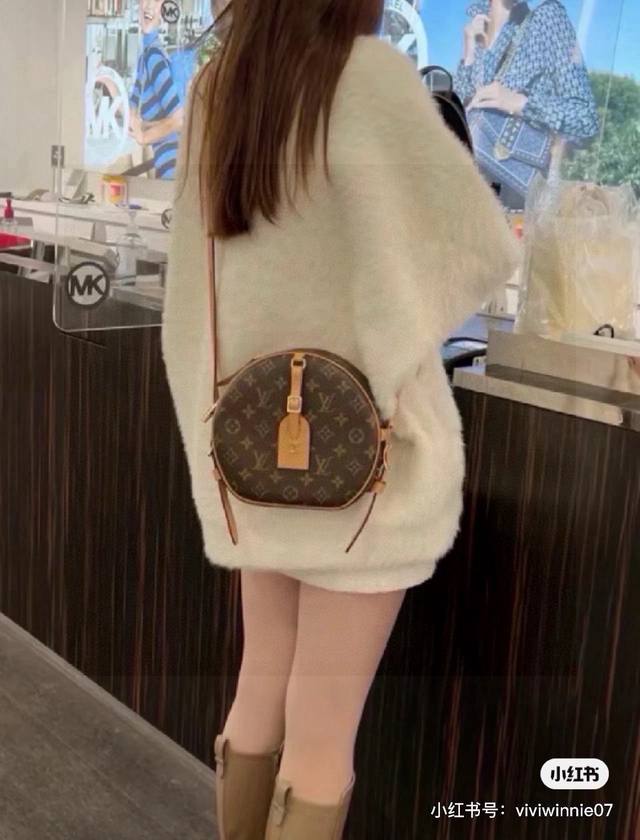 . Because most bags are square, round bags are both cute and unique. The monogram design overshadows the cuteness without looking overly youthful, creating a cool, casual, and stylish look. The large round bag features a luggage tag, adding the finishing touch to the stylish look without being monotonous. It's simply stunning.