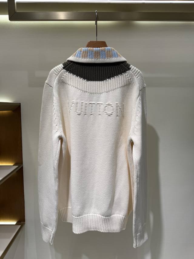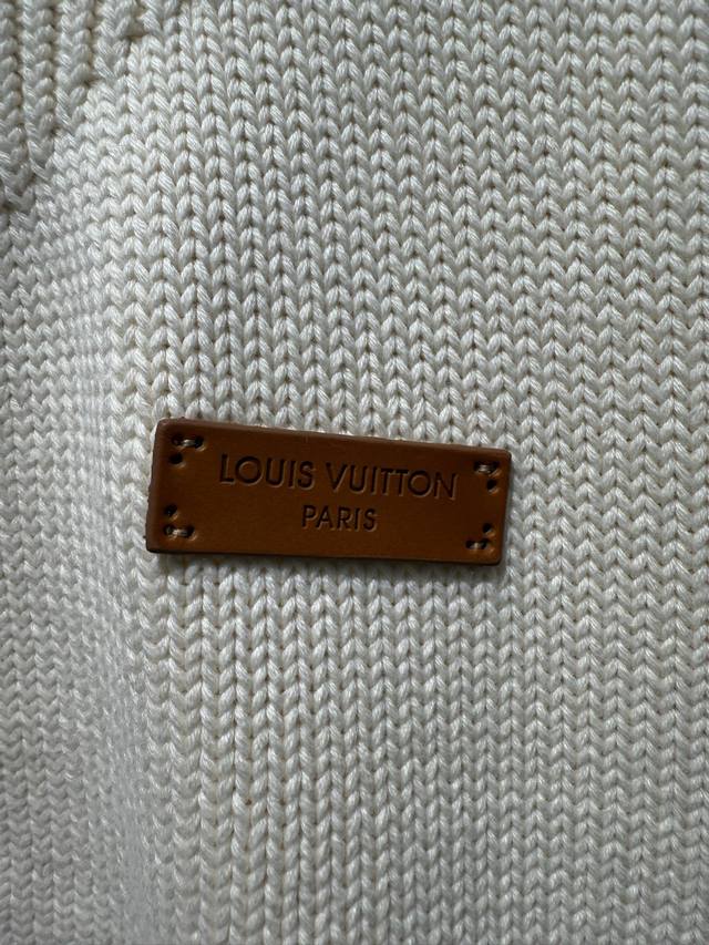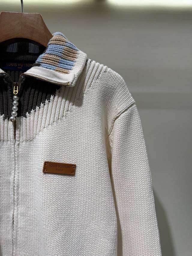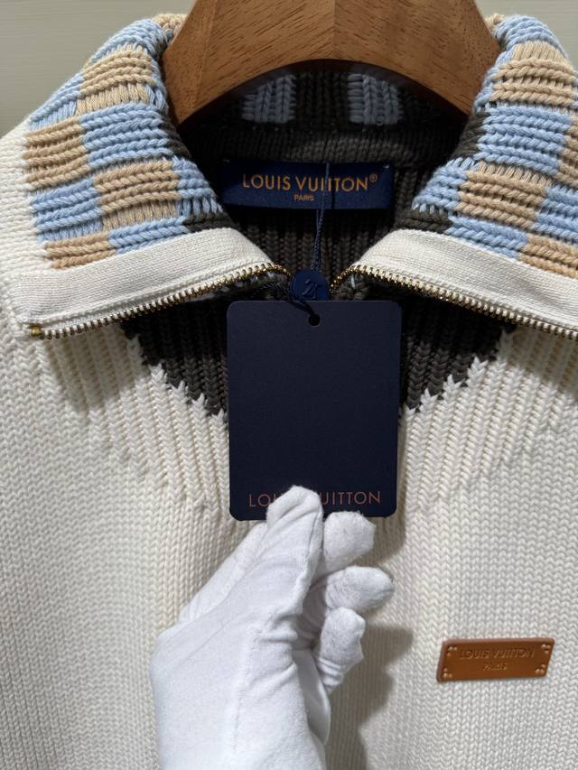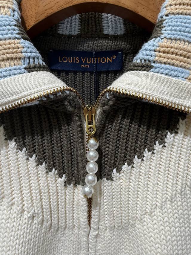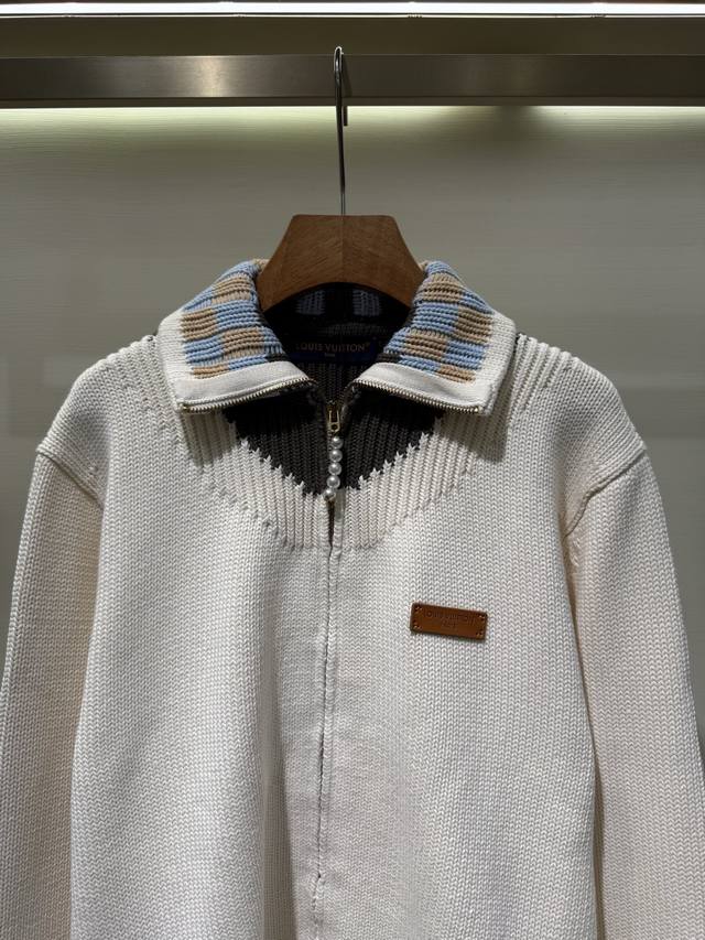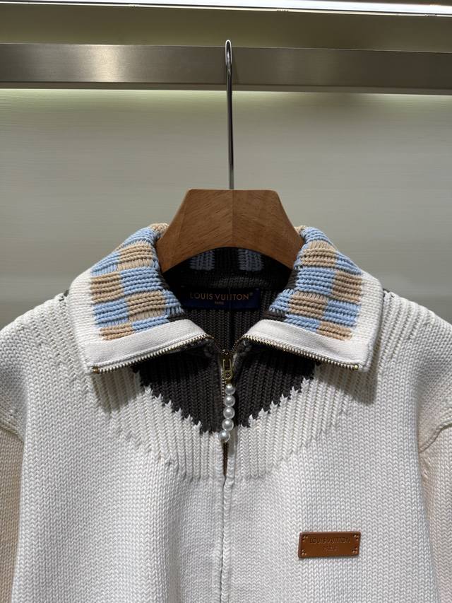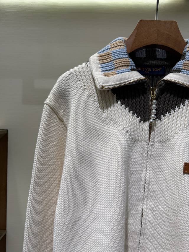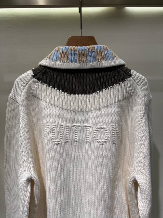 Lv Zippered Intarsia Knit Cardigan Jacket DDD This wool knit sweater is a versatile layering piece suitable for all seasons, and can be worn as a cardigan or a light jacket. The collar features a colorful Damier pattern, while the back is adorned with a similarly textured Vuitton signature logo. Details include a pearlescent zipper pull and a leather patch on the chest. DDD Fabric: 70% Wool, 30% Sheep Wool DDD Craftsmanship: Custom pearlescent zipper pull, leather patch on chest DDD Sizes: S, M, L, XL Ddd 2333537 DDD