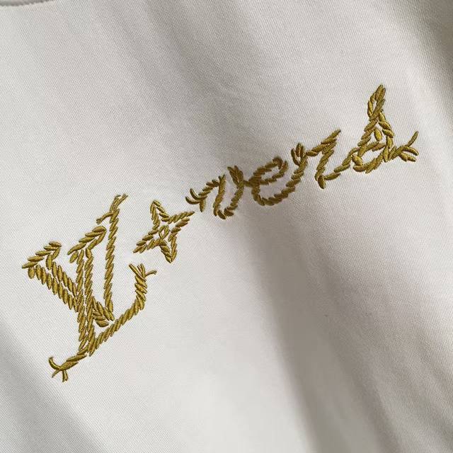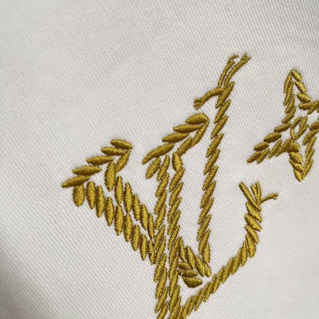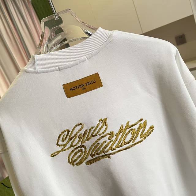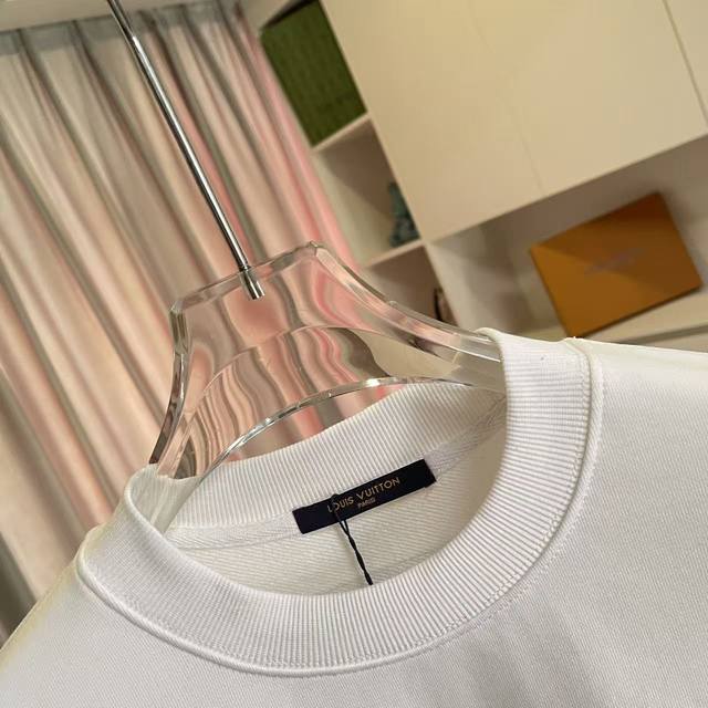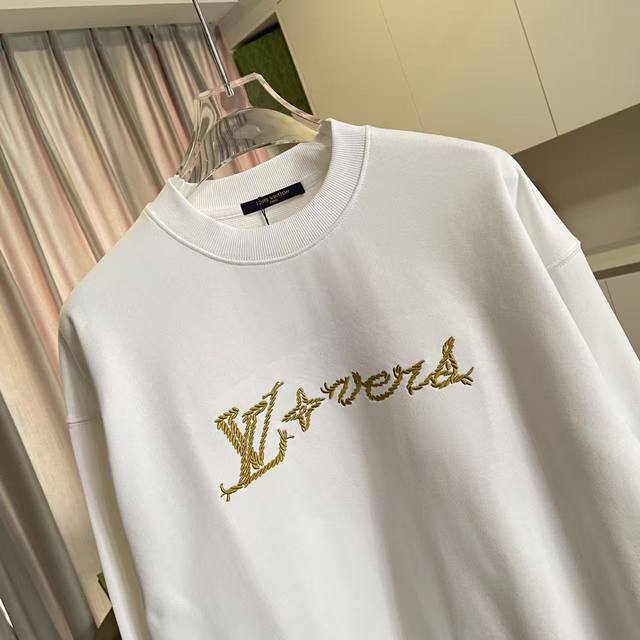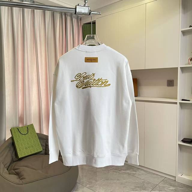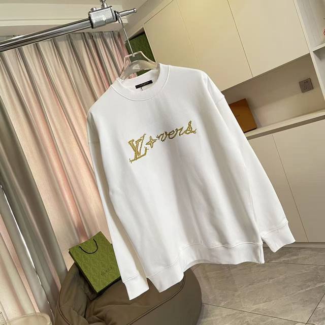 Lv*2025 Autumn/Winter New Arrival, Gold Thread Embroidered Letter Logo, Custom Fabric 400G, Crew Neck Sweatshirt with Complete Labels, Unisex Style. Sizes: S, M, L, XL, XXL (five sizes available). Colors: Black, White.