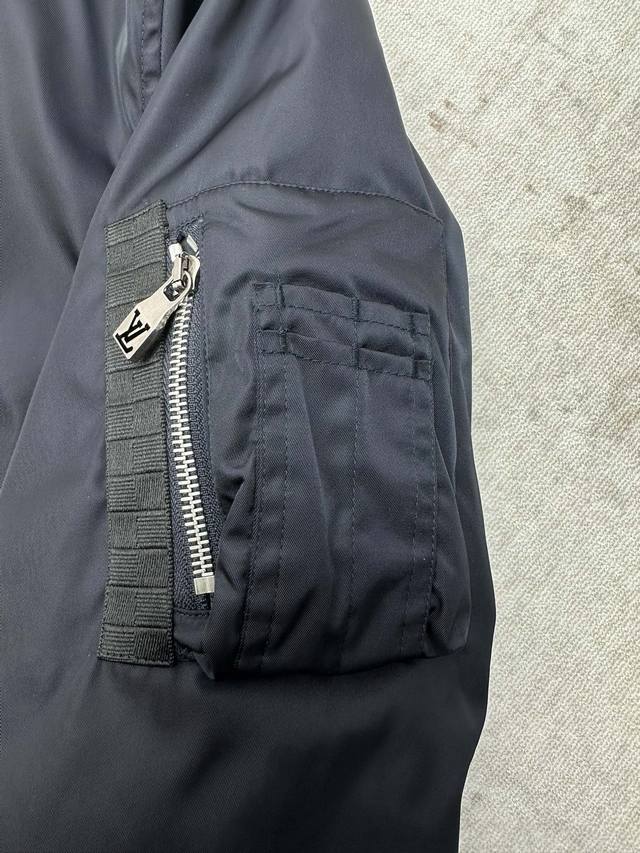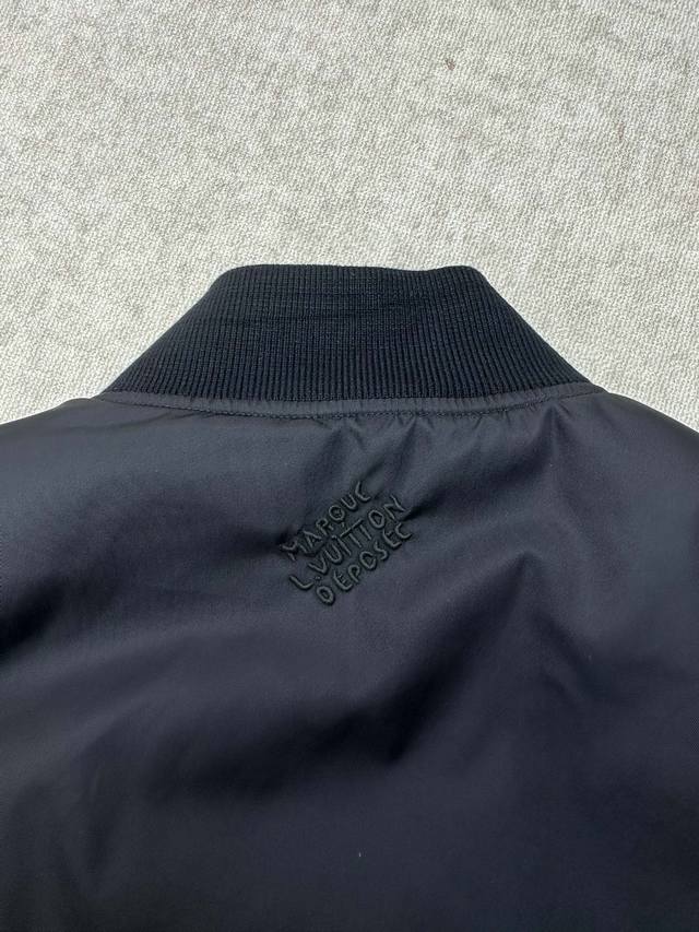 L'Vuitton 25Ss New Flight Jacket. This flight jacket is from the 2025 Fall/Winter collaboration between pharrell Williams and Nigo. It features a cropped cut crafted from a lustrous technical twill fabric, paired with a modern kimono-style collar, inspired by Tokyo country rock. The sleeve pockets are adorned with Damier grosgrain trim, and the three-dimensional Marque L.Vuitton D
