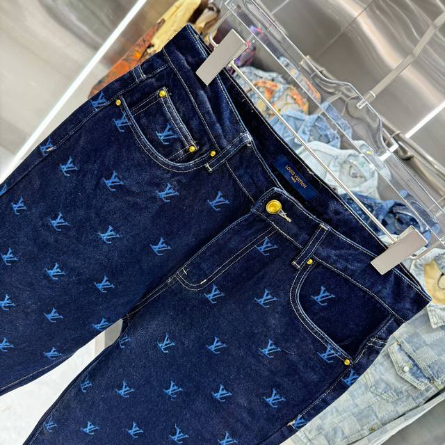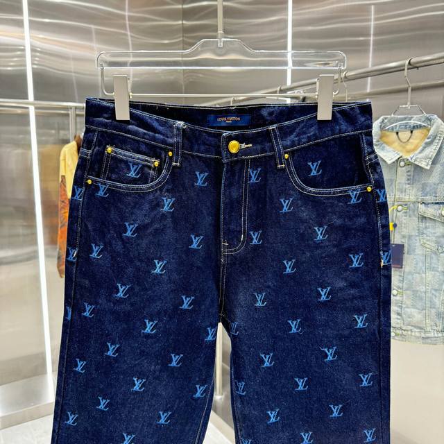 / New Louis Vuitton jeans with all-over embroidered logo, featuring a unique tie-