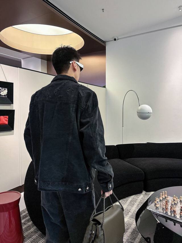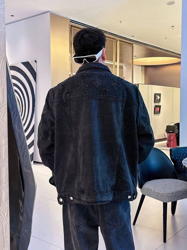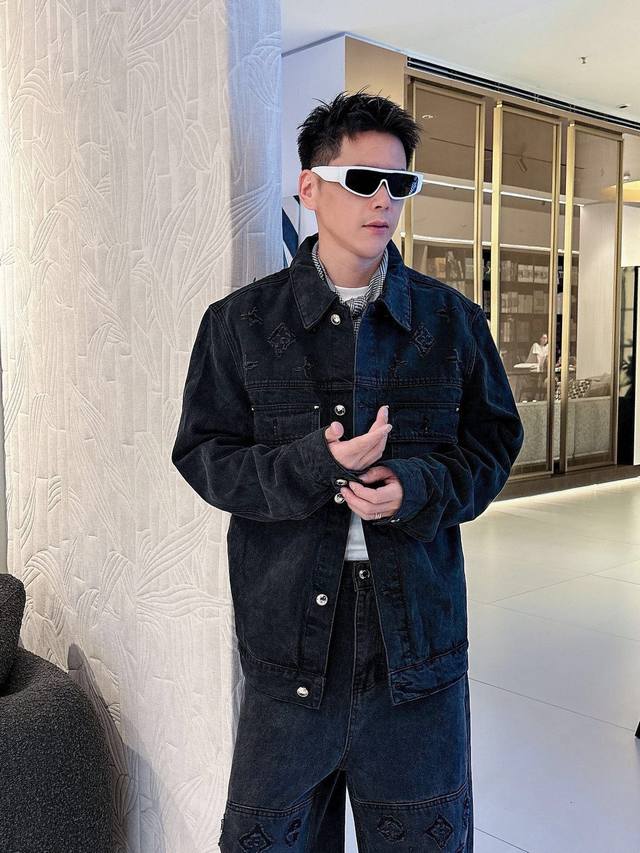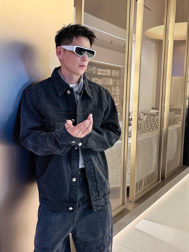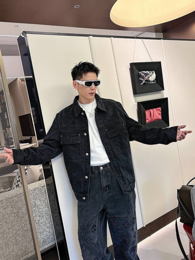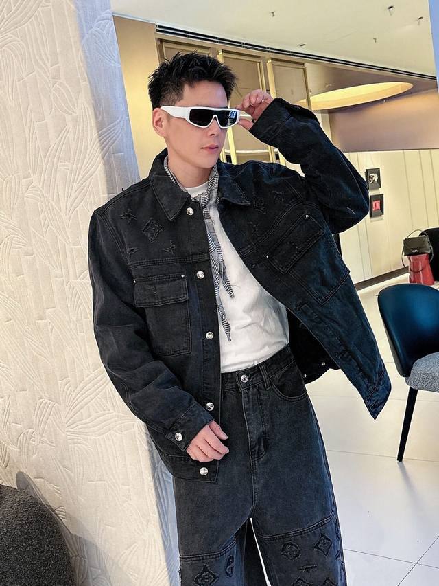 New Lv Hand-Distressed All-Over Logo Print Jacket. Made entirely of custom-woven heavyweight denim fabric, with independent hardware molding and heavy-duty washing, resulting in strong water resistance and excellent abrasion resistance. The overall finish after washing is excellent luster, soft and thick to the touch, with a simple and versatile design. It's sturdy and won't easily deform. A must-have basic jacket, its classic and versatile design is sure to win you over at first sight! Unisex. Colors: Black, Blue. Sizes: M-3XL. Style Number: 3075.