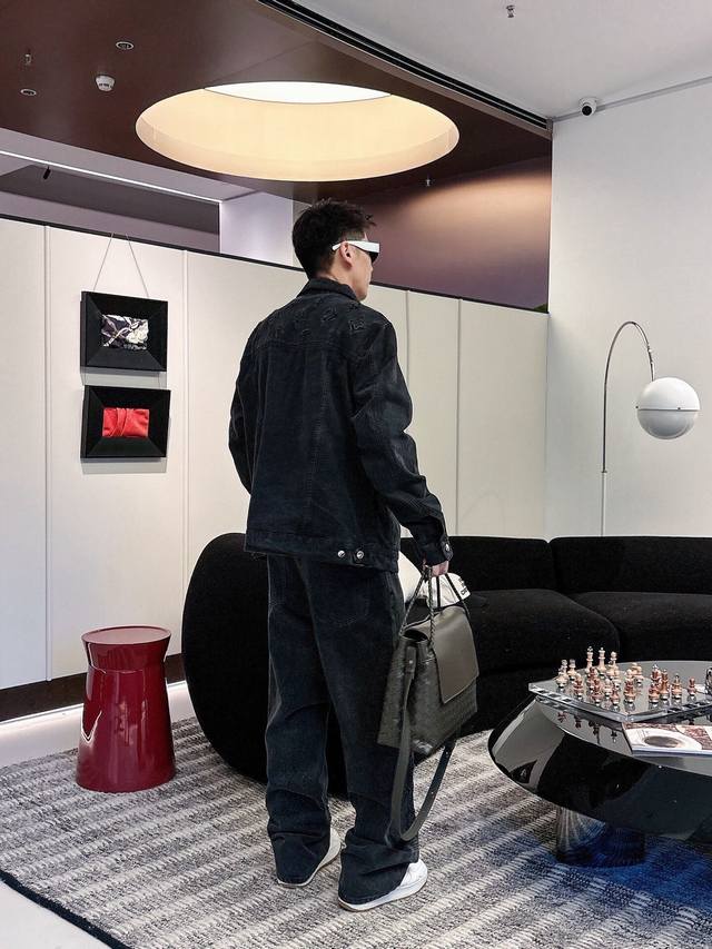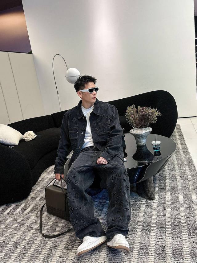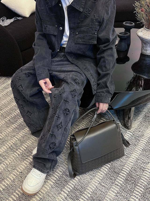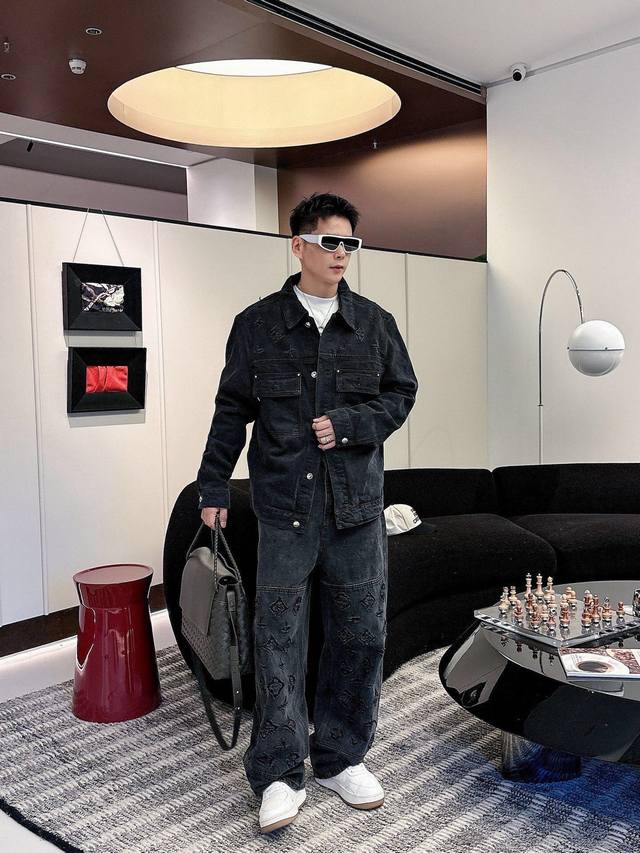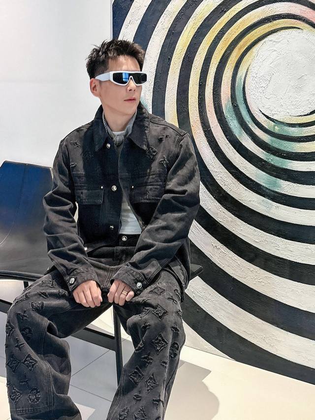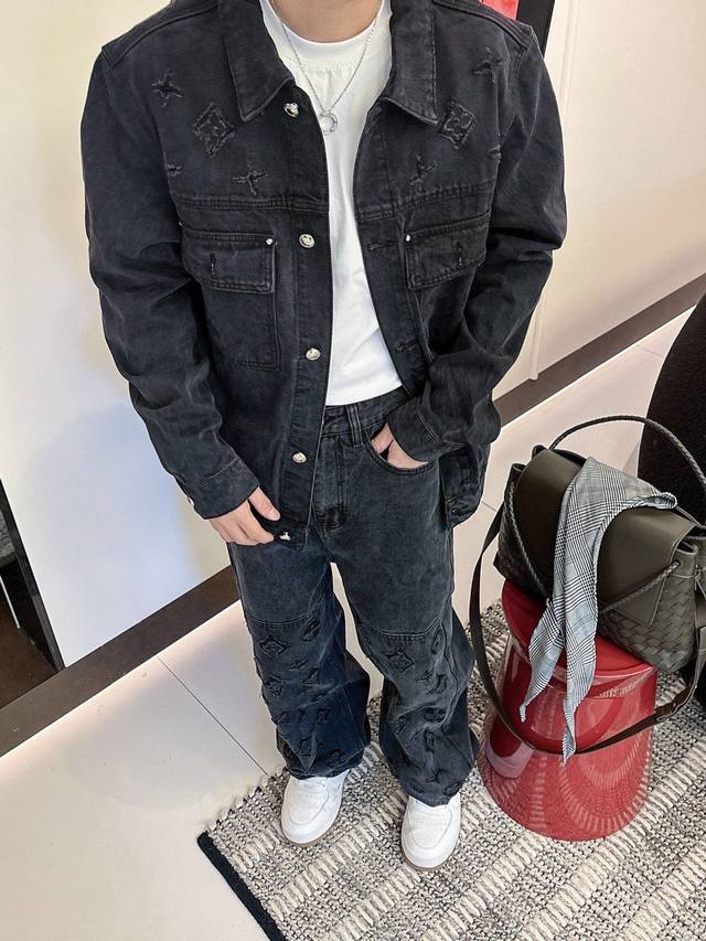 New Lv Hand-Distressed All-Over Logo Print Jacket. Made entirely of custom-woven heavyweight denim fabric, with independent hardware molding and heavy-duty washing, resulting in strong water resistance and excellent abrasion resistance. The overall finish after washing is excellent luster, soft and thick to the touch, with a simple and versatile design. It's sturdy and won't easily deform. A must-have basic jacket, its classic and versatile design is sure to win you over at first sight! Unisex. Colors: Black, Blue. Sizes: M-3XL. Style Number: 3075.