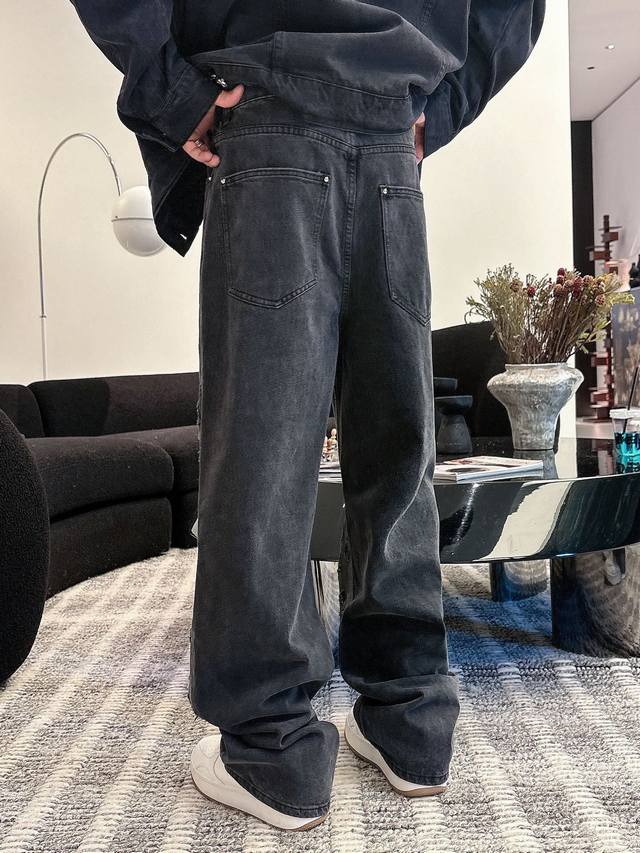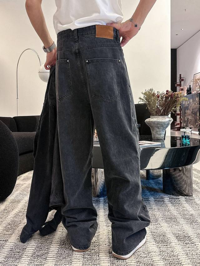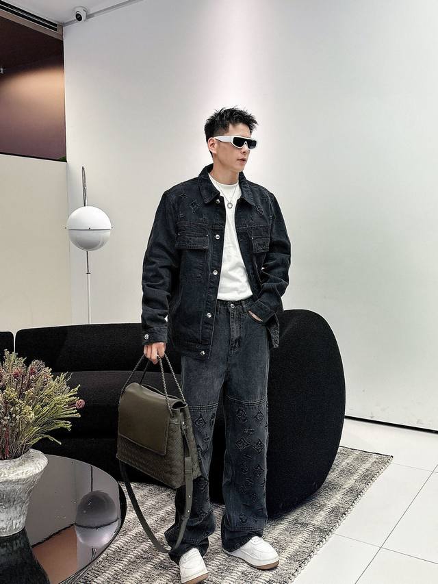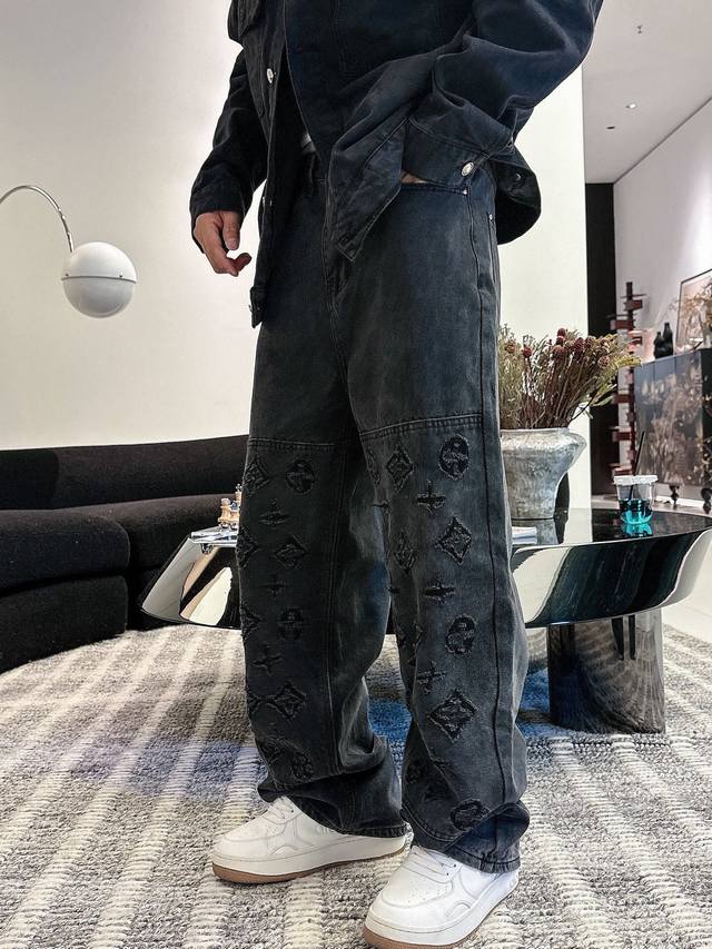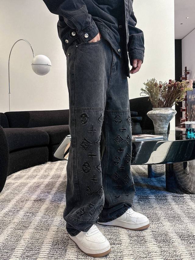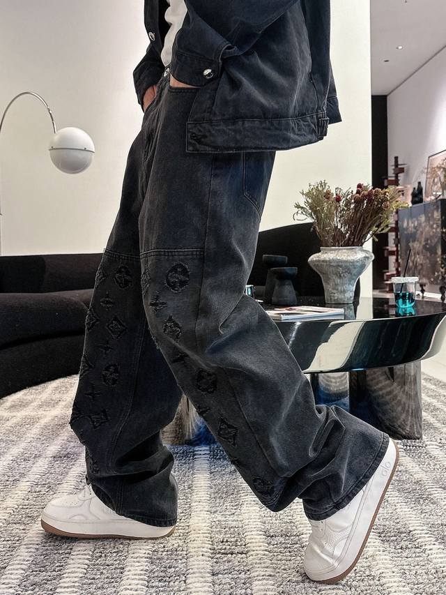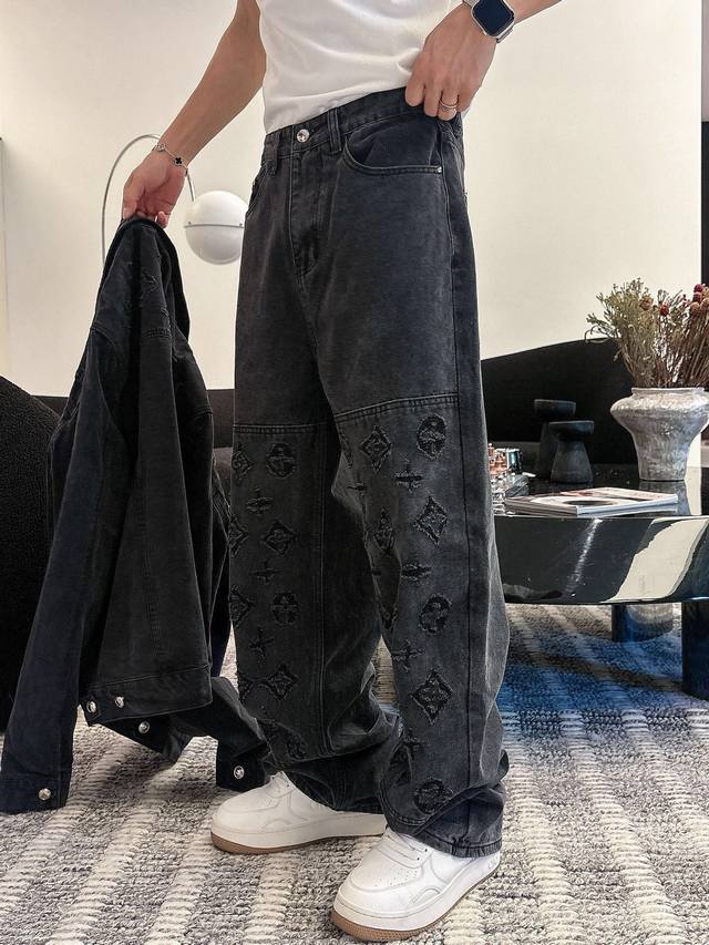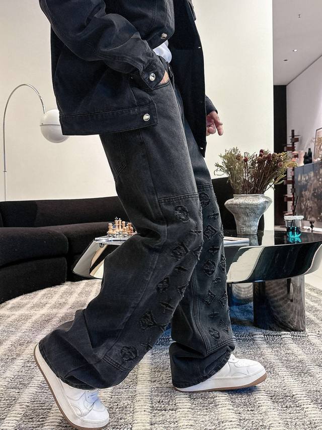 Pants. New Lv hand-distressed distressed jeans with all-over logo print. Made entirely of custom-woven heavyweight denim fabric, with independent hardware molding and heavy-duty washing, resulting in strong water resistance and excellent abrasion resistance. The overall finish after washing is excellent, with a soft and thick feel. The simple and versatile design is sturdy and won't easily deform. A must-have basic for any outfit, the classic and versatile design is love at first sight! Unisex. Colors: Black, Blue. Sizes: M-3XL. Style Number: 30753761