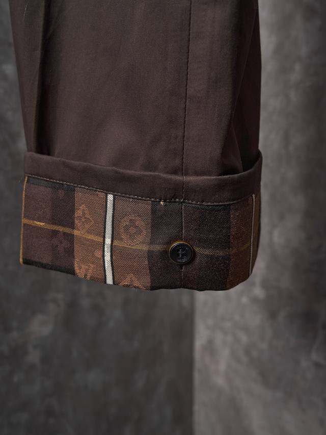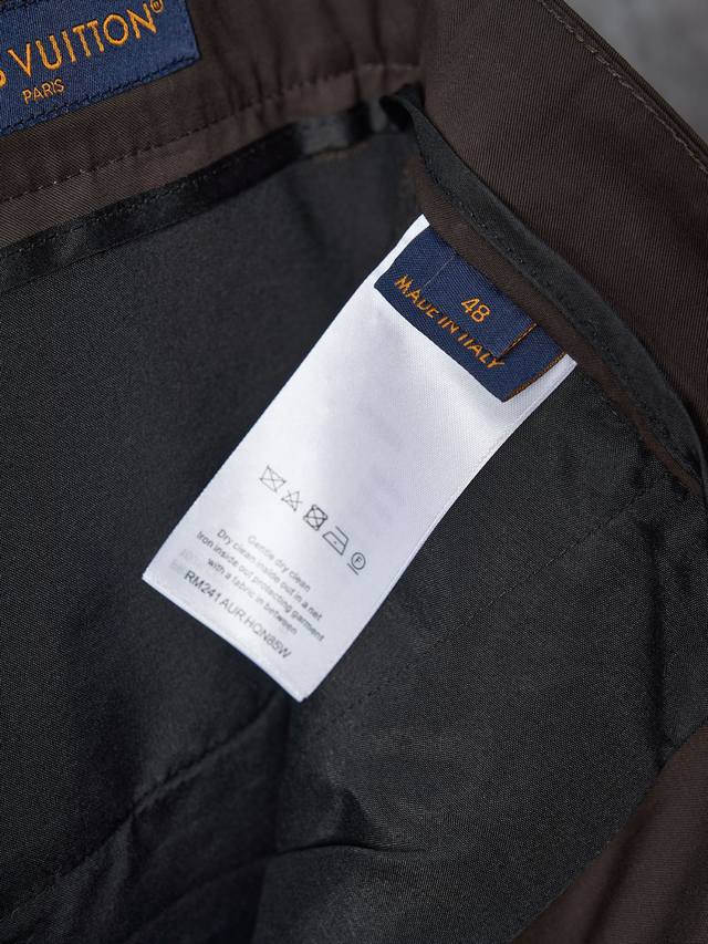 Real item hanging photo LV Louis Vuitton woven ribbon embroidered logo check casual trousers DDD Ddd In stock 46 48 50 52 DDD Custom-made cotton mercerized wool fabric with superior texture, comfortable against the skin. The deep brown is a gentle color symbolizing power. The sides of the trousers are embellished with the LV logo woven ribbon, making them highly recognizable. The exquisite detail is hidden when the cuffs are rolled up. The Monogram classic check pattern on the lining is understated yet sophisticated, effortlessly high-end. Each check tells the story of the brand's century-old heritage. It is understated yet sophisticated, subtly revealing and discreetly flaunting. It is a power gene worn on the body. This suit is worry-free for any occasion. DDD The fabric jacquard process uses a full-width Monogram check jacquard weave technique to control the interlacing of warp and weft threads, precisely controlling the interlacing density and tension of the yarns to make it more three-dimensional. DDD Imported machine embroidery technology uses an advanced computer control system and precision mechanical parts to achieve high precision in the LV logo woven ribbon embroidery, resulting in smooth and delicate lines. DDD Human body 3D tailoring returns to traditional craftsmanship through techniques such as segmentation, folding, gathering, and stretching. The saying "slow and steady wins the race" reflects respect for the materials and a pursuit of a refined feel. The complex and tedious process results in slow production and high material waste. The soft-light washing process, through specific chemical and logistical treatments, gives the fabric a soft sheen, adding a touch of gentle elegance. The loose fit is perfect for this style.